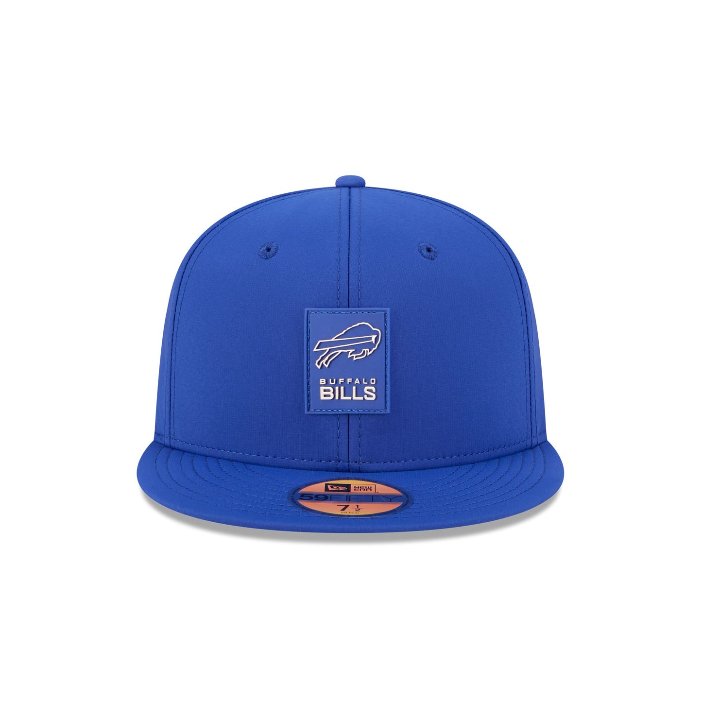 The Buffalo Bills 2025 Sideline Hot Weather 59FIFTY Fitted Cap features a sewn-down silicone Bills logo patch at the front panels with the Official NFL Shield logo at the rear. The cap has a water-repellent quill tech fabrication throughout, with a quick-dry cushioned sweatband to absorb moisture. The undervisor is accented with a silicone transfer in the team’s colors.