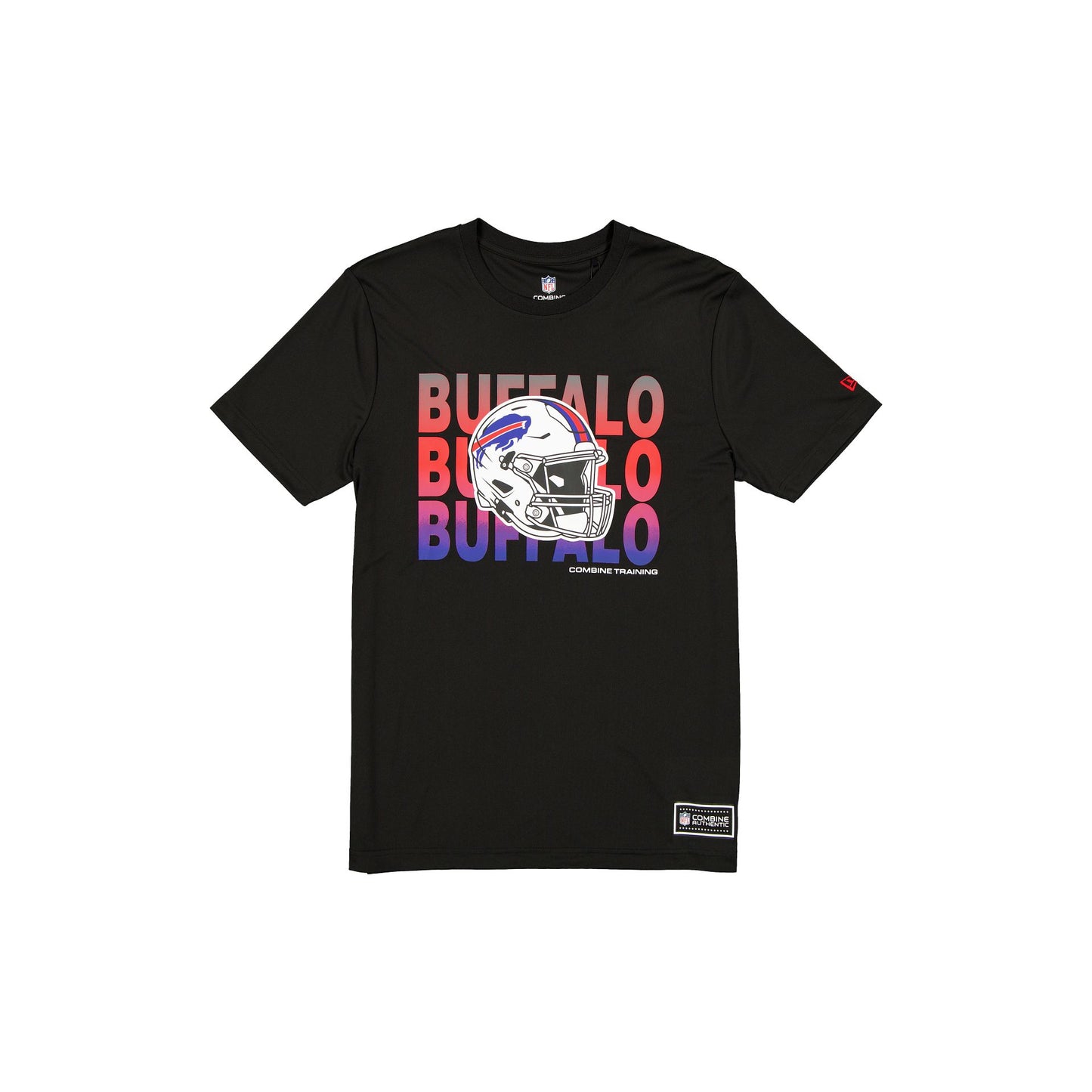 The Buffalo Bills 2025 Training Black T-Shirt features a screen-printed Bills helmet graphic at the chest with a heat sealed NFL Combine Authentic jock tag at the hem.