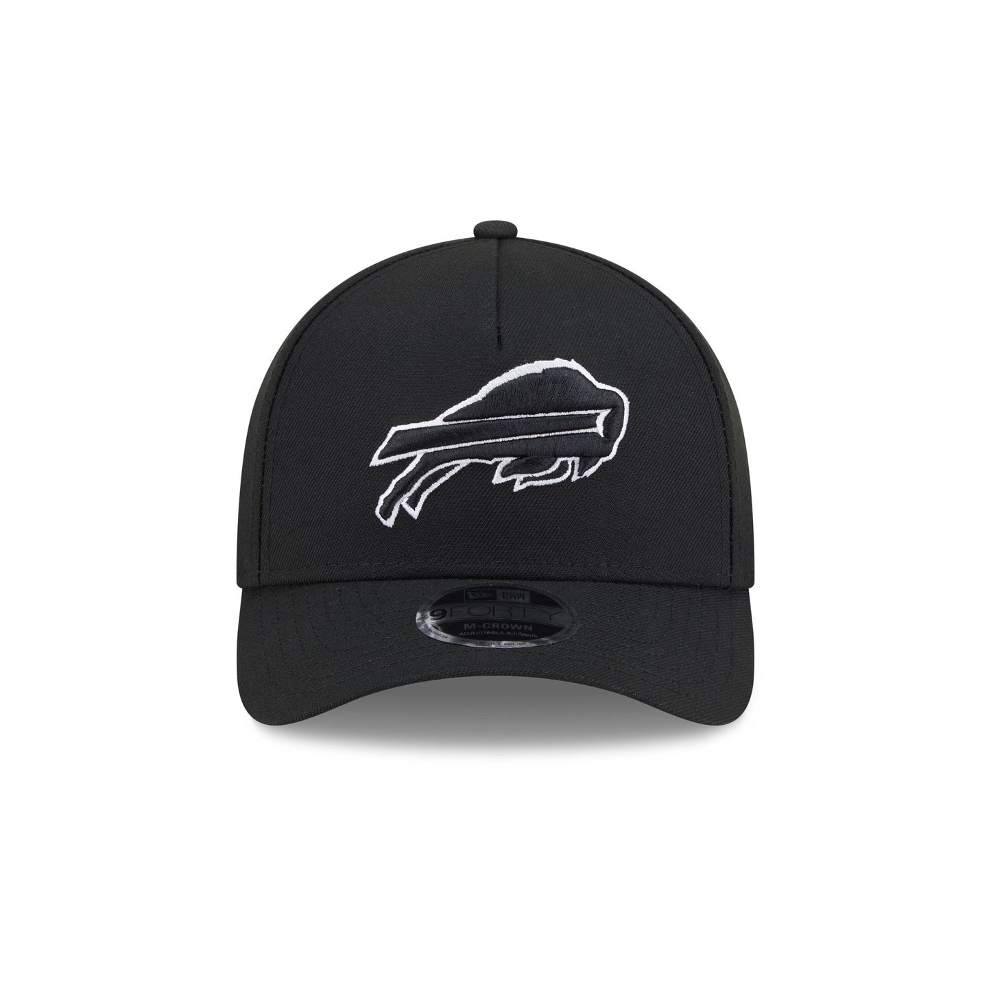 The Buffalo Bills Black & White 9FORTY M-Crown A-Frame Snapback features an embroidered Bills logo at the front panels with an adjustable snapback closure at the rear and a gray undervisor.