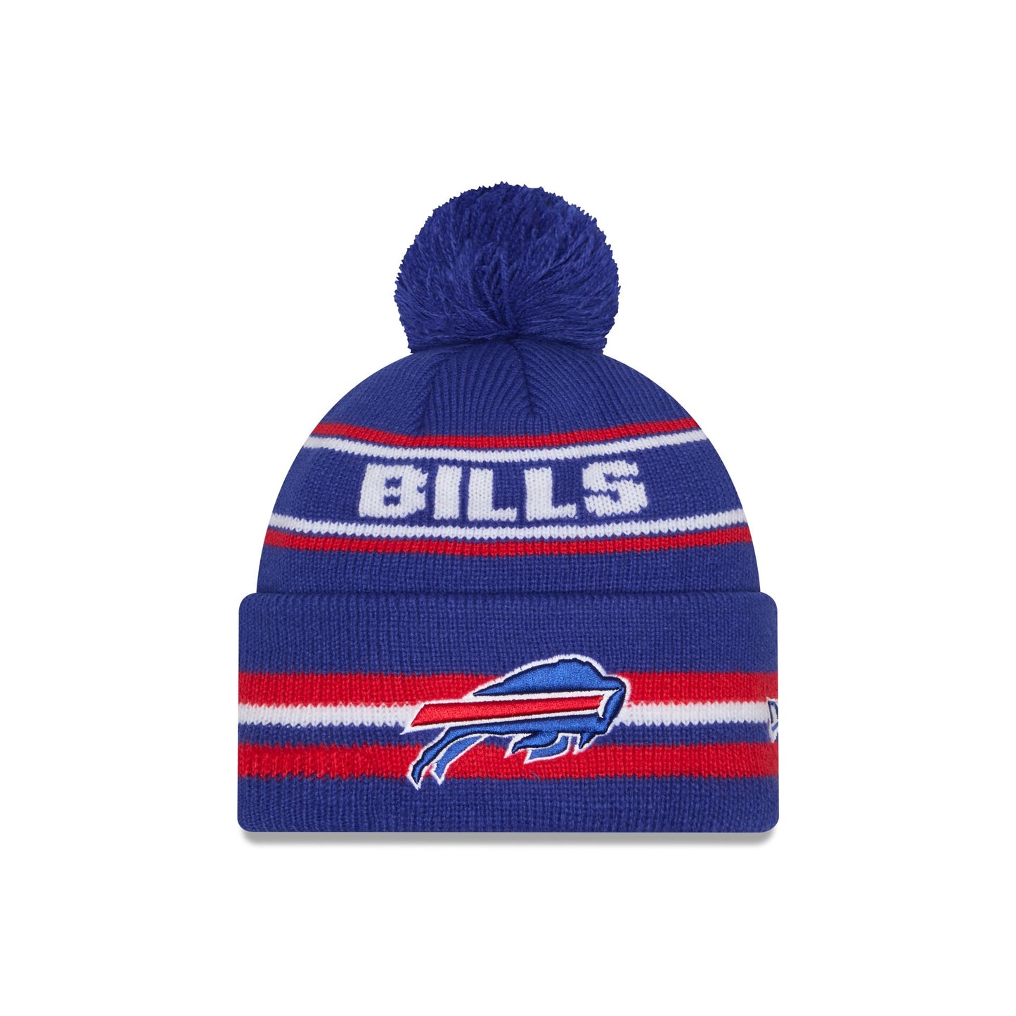 The Buffalo Bills Classic Pom Knit Hat features an embroidered Bills logo at the front cuff with a wordmark at the crown and a one-time removable pom.