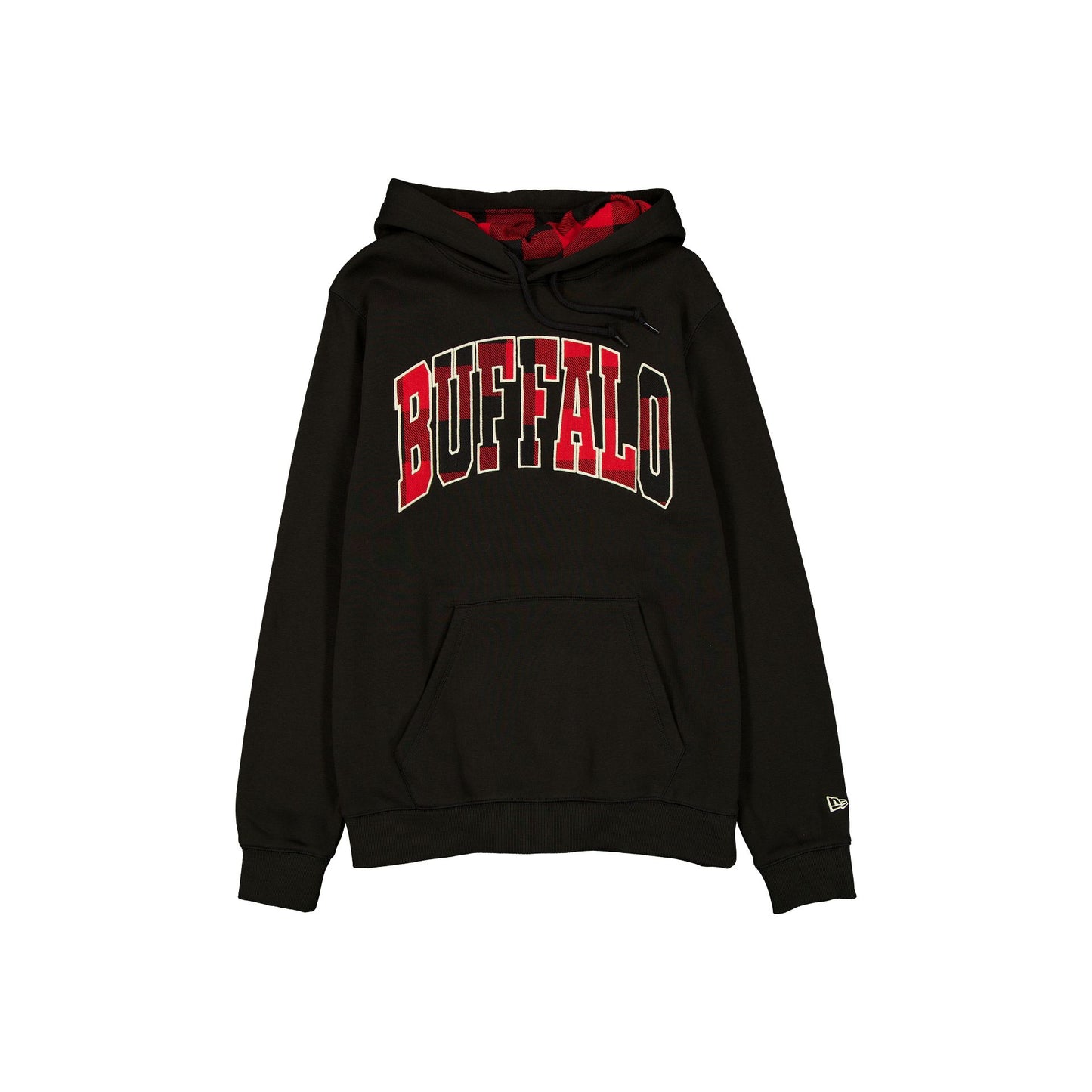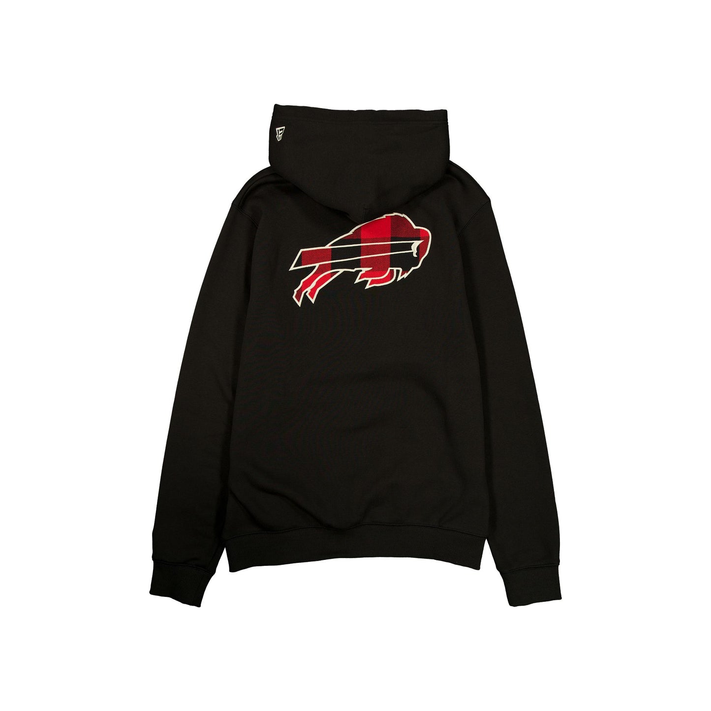 The Buffalo Bills Evergreen Check Hoodie features an embroidered applique Bills checkered wordmark at the front with a matching interior hood and logo at the rear. Additional details include kangaroo pockets and adjustable drawstrings at the hood.