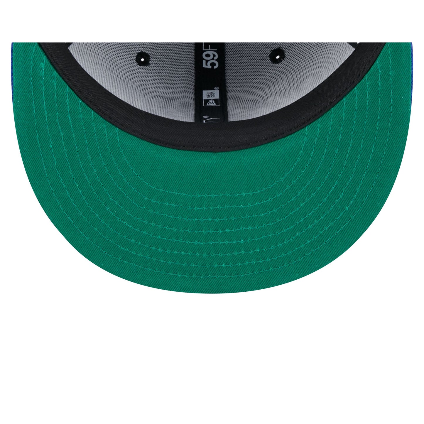 The Buffalo Bills Faux Leather Crown 59FIFTY Fitted Cap features an embroidered Bills wordmark at the front panels with a matching NFL Shield at the rear, a blue visor, and green undervisor.