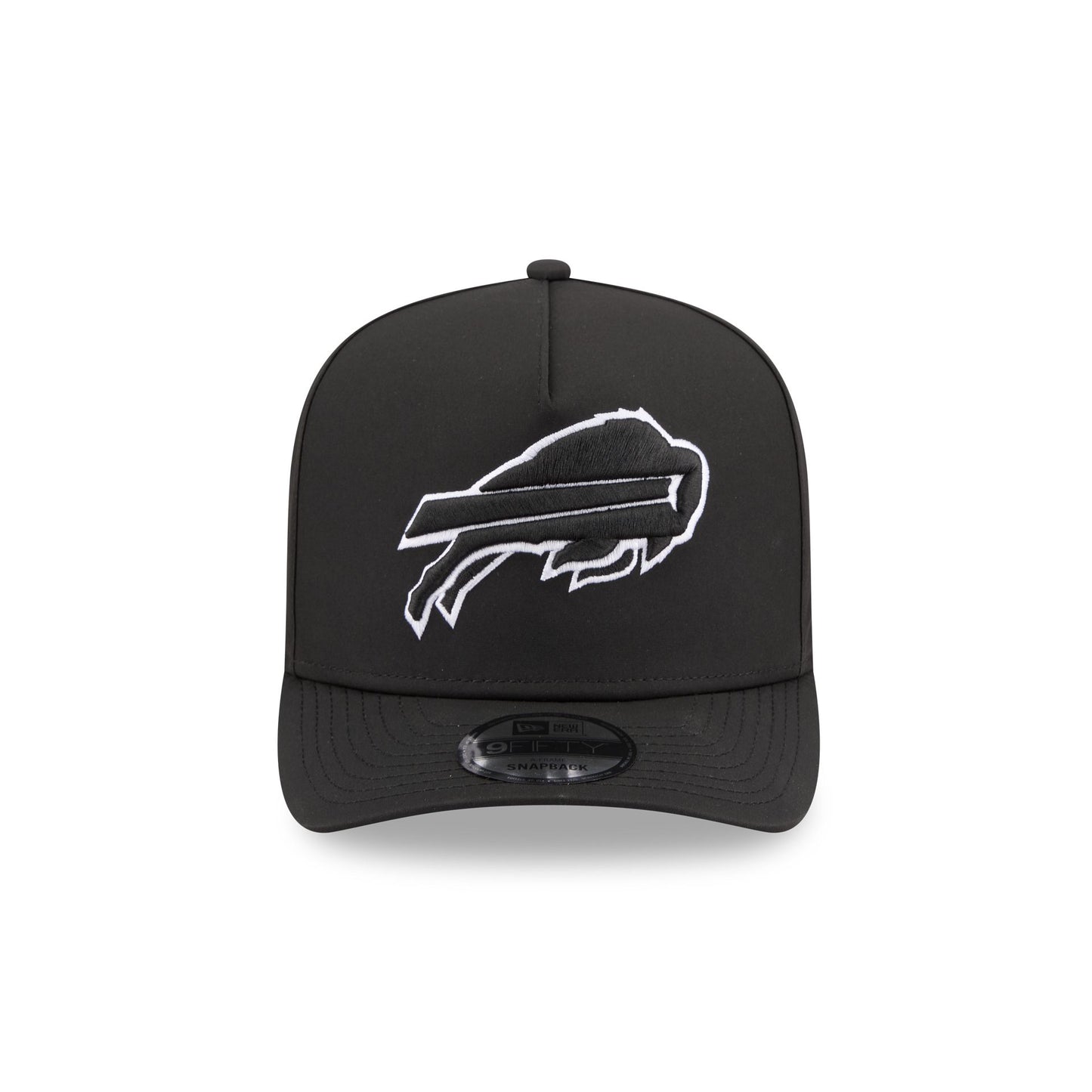 The Buffalo Bills GORE-TEX Black 9FIFTY A-Frame Snapback features an embroidered white Bills logo at the front panels with a metallic sheen silicone New Era Flag logo and GORE-TEX logo at the left-wear side. Additional details include an adjustable snapback closure at the rear, a gray undervisor, and a polyester fabrication throughout the cap. It is waterproof, breathable, and lightweight.