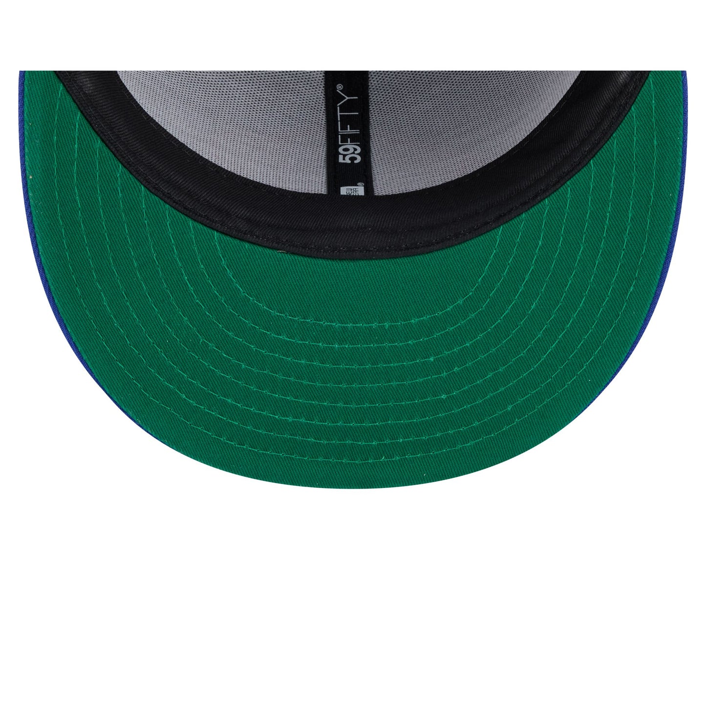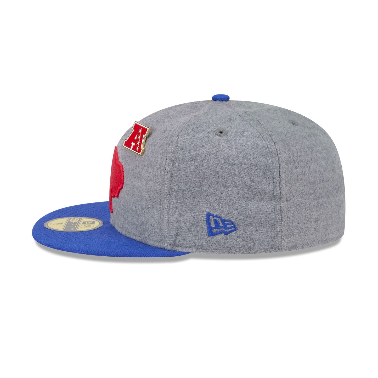 The Buffalo Bills Heather Gray Wool 59FIFTY Fitted Cap features an embroidered Bills Historic logo and conference pin at the front panels against a wool fabrication throughout. Additional details include a helmet graphic at the right-wear side, an NFL Shield logo at the rear, and a green undervisor.