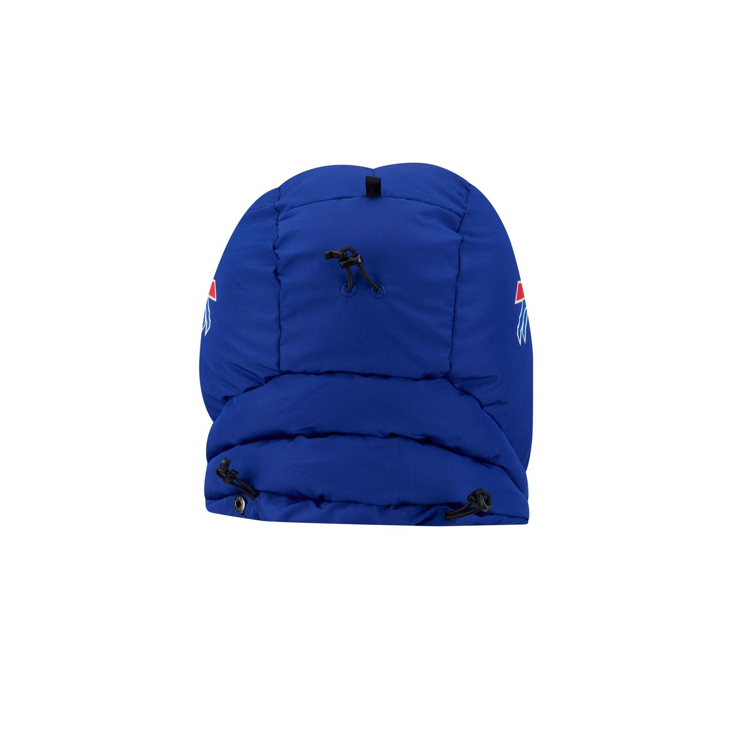 The Buffalo Bills Helmet Puffer Hood features an embroidered Bills wordmark at the front with a helmet design at each side. Additional details include an insulated filling with adjustable drawstrings at the back of the head and neck. The puffer helmet has a 4 snap-button closure at the right.
