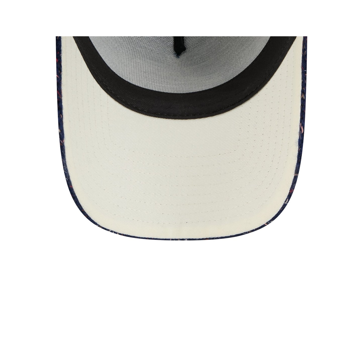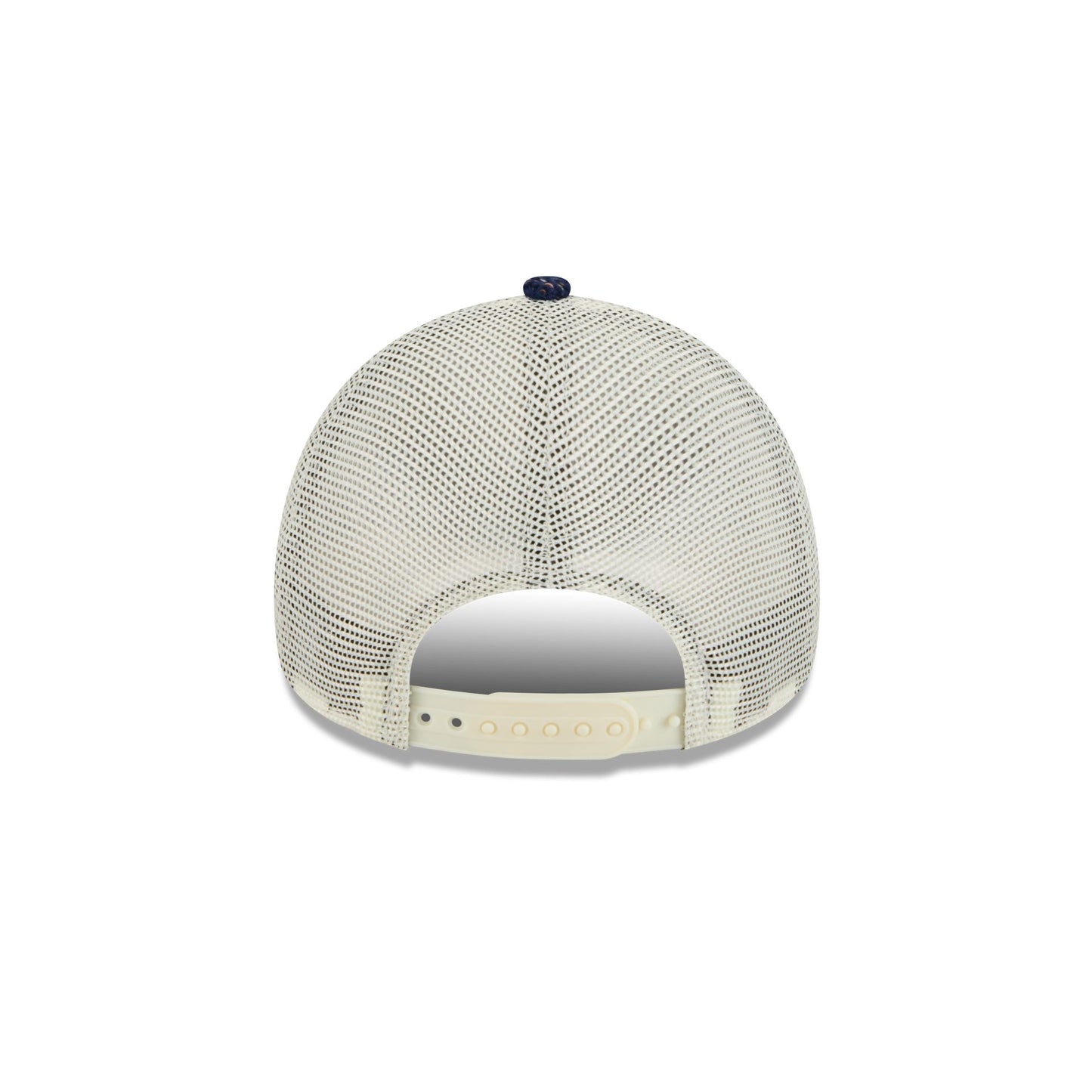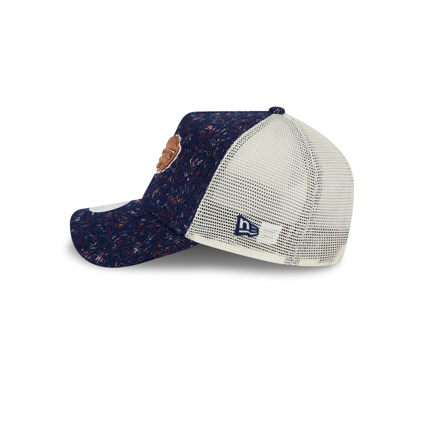 The Buffalo Bills Knit Women's 9FORTY A-Frame Trucker features an embroidered Bills logo at the front knit panels. Additional details include a snapback closure at a mesh rear and white undervisor.