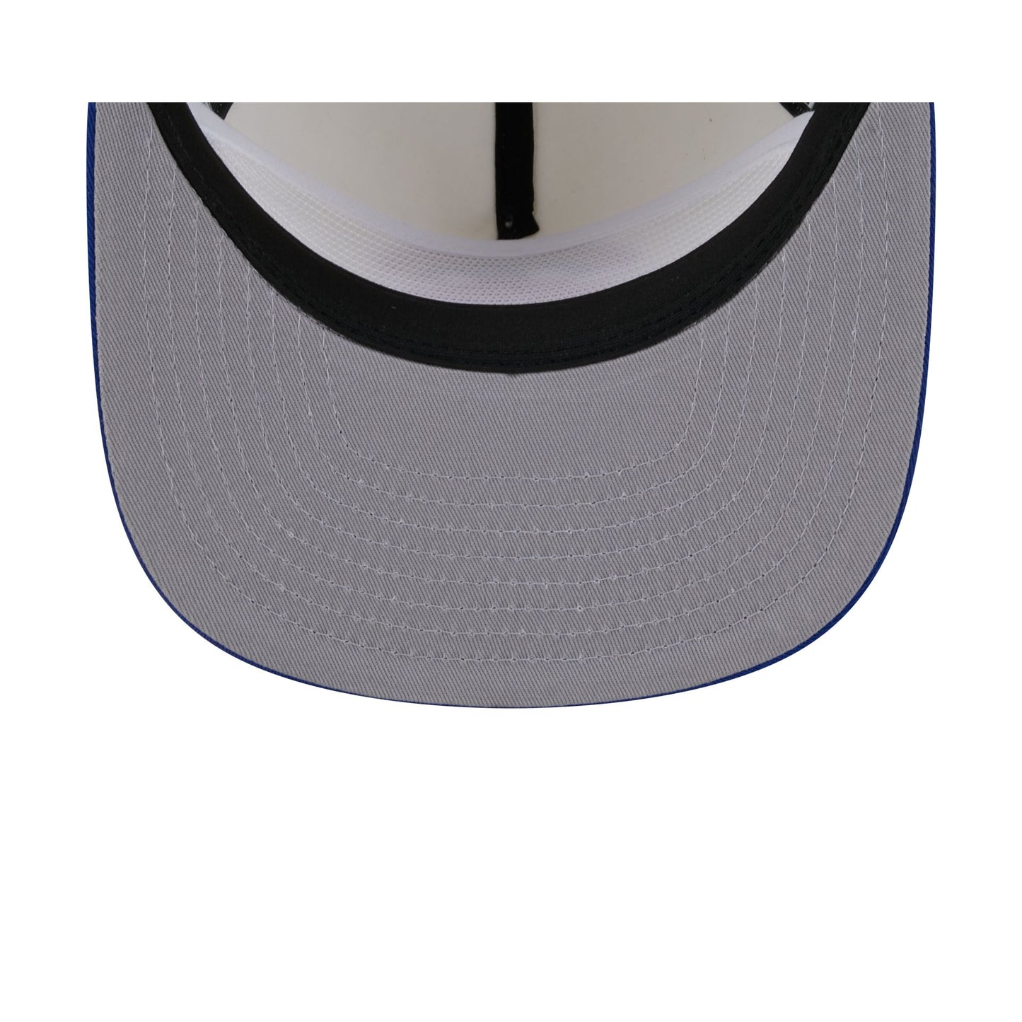 The Buffalo Bills Pro Bowl Patch Golfer Cap features an embroidered 1985 Pro Bowl patch at the front panels with a Bills logo on the right-wear side with snapback closure at the rear, a blue visor, and gray undervisor.