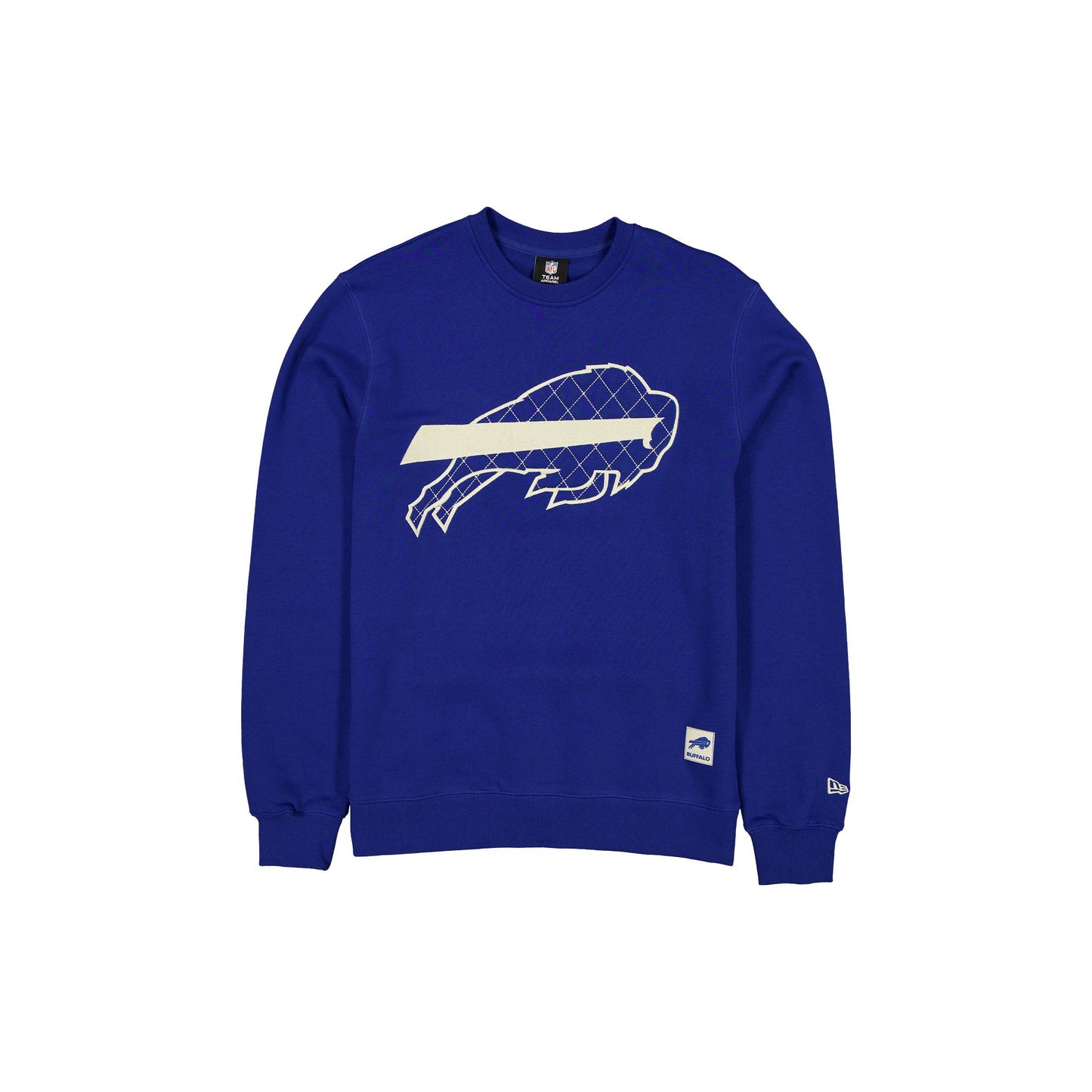 The Buffalo Bills Quilted Crewneck features a diamond quilt embroidered Bills logo at the chest with a matching team jock tag at the hem.