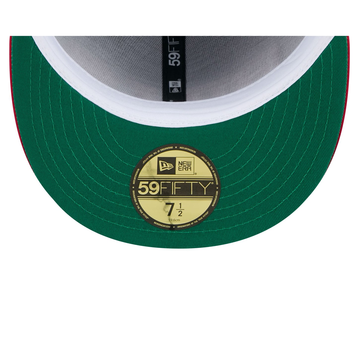 The Buffalo Bills Spring Satin 59FIFTY Fitted Cap features an embroidered Bills wordmark at the front panels with a New Era pin at the top left panel and an NFL Shield logo at the rear. Additional details include a satin fabrication throughout, a logo at the right-wear side, and a green undervisor.