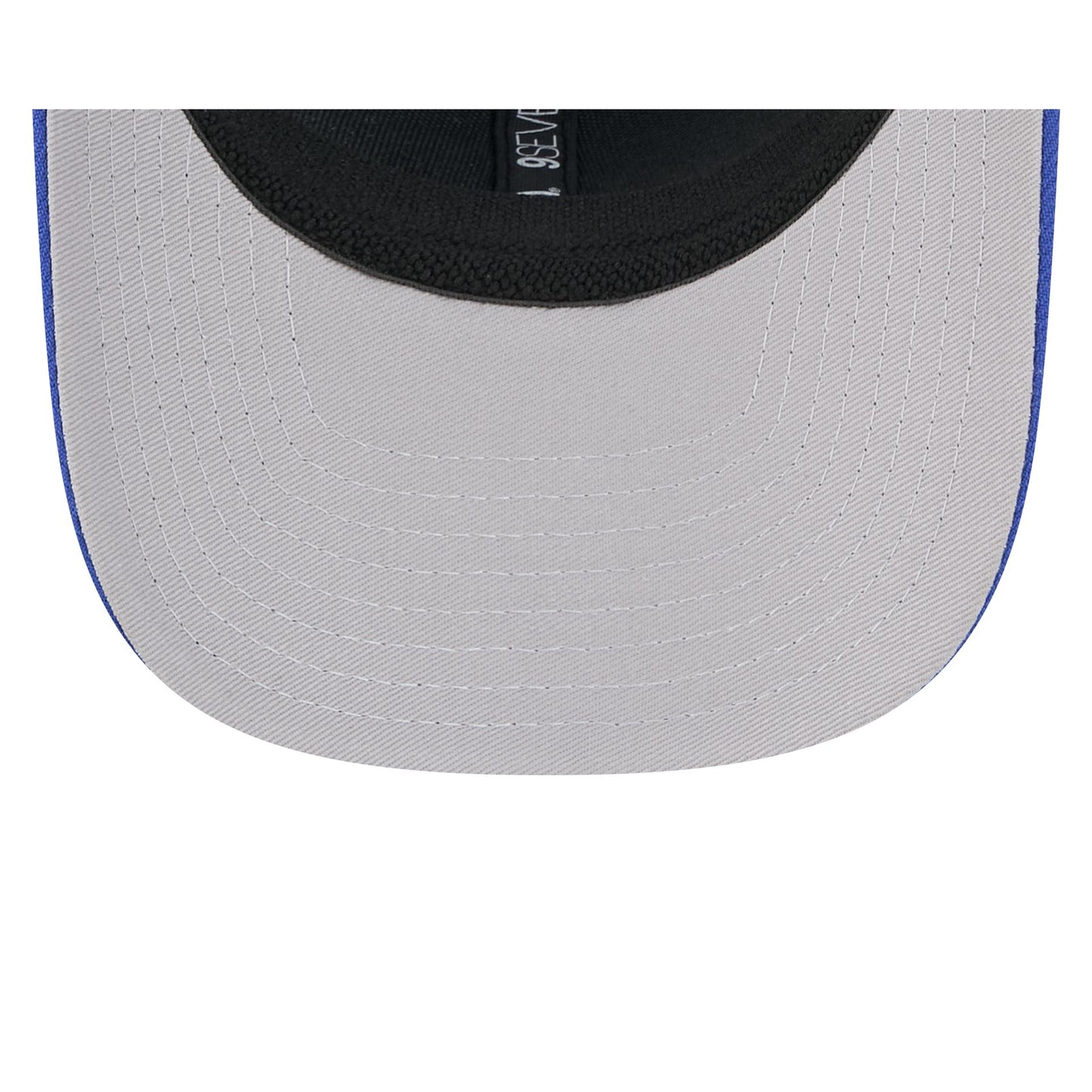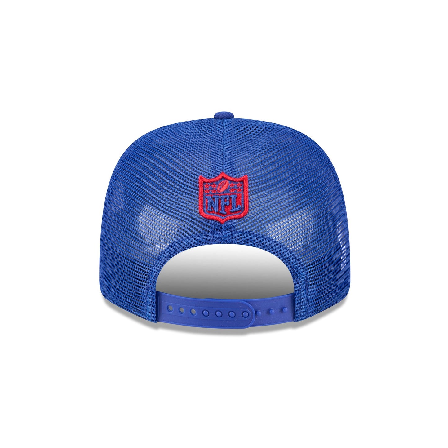 The Buffalo Bills Team 9SEVENTY Trucker features an embroidered Bills logo at the front panels with a matching NFL Shield logo above an adjustable snapback closure at a mesh rear and a gray undervisor.
