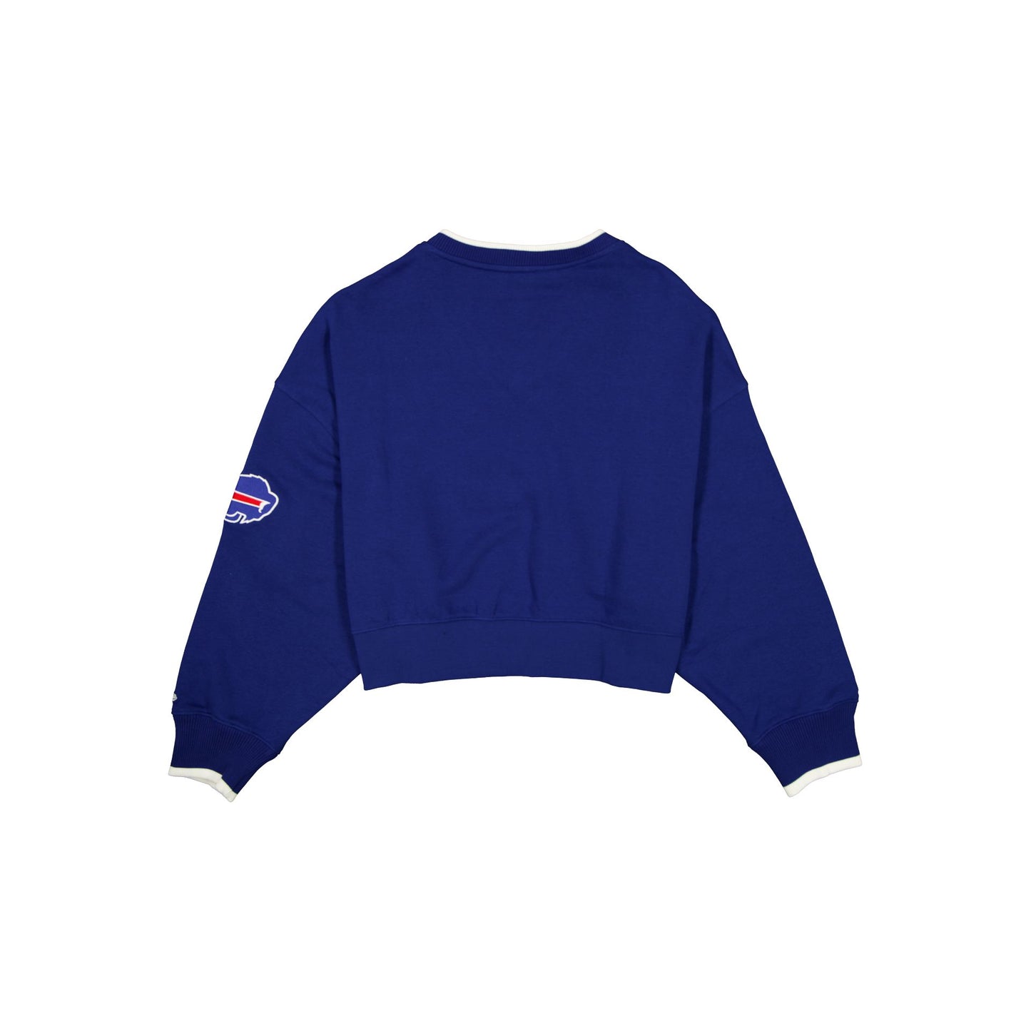 The Buffalo Bills Throwback Prep Women's Cropped Crewneck features a screen-printed Bills wordmark at the chest with an embroidered script wordmark below. Additional details include an embroidered logo at the left arm and a cropped fit.
