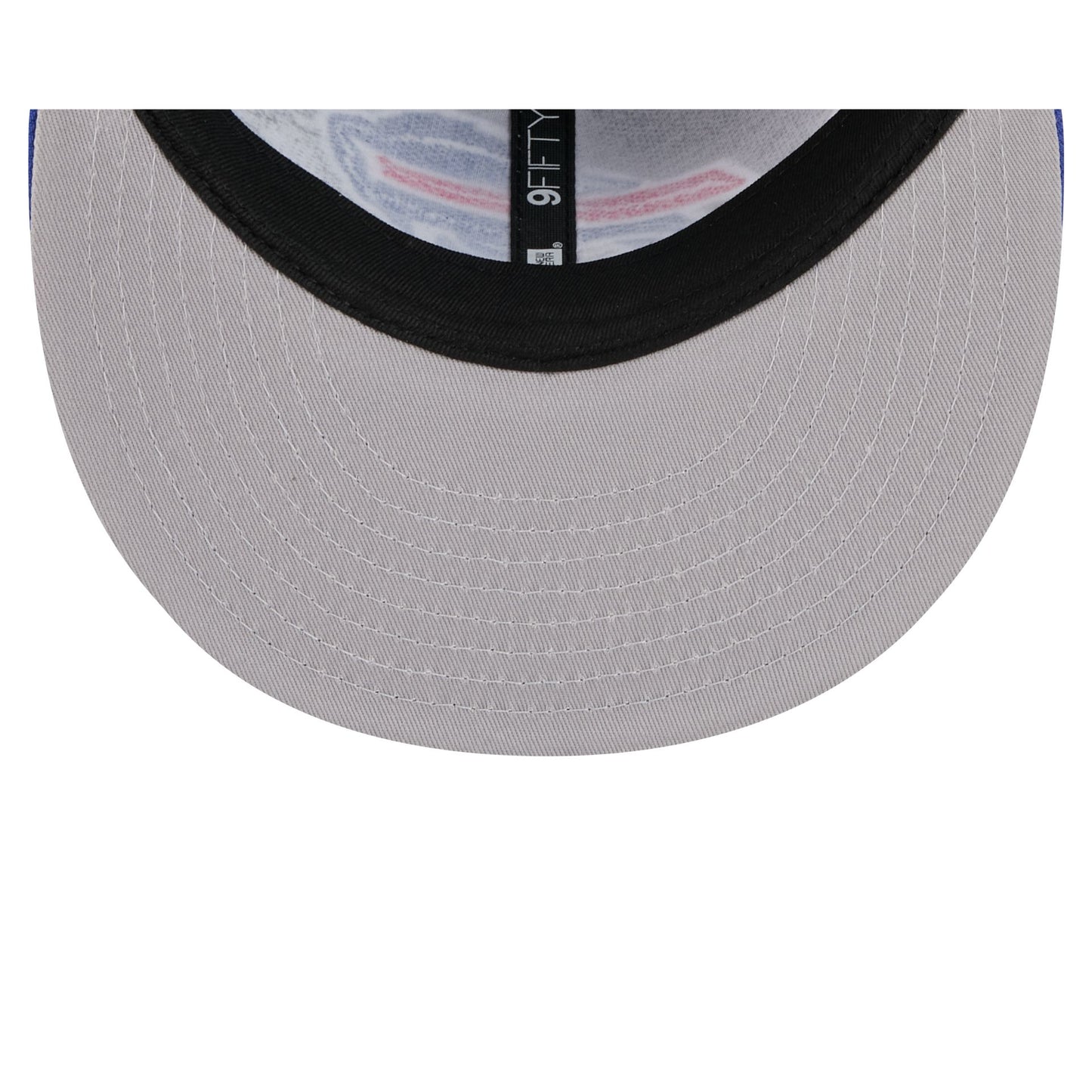 The Buffalo Bills Tidal Flow Retro Crown 9FIFTY Adjustable Cap features an embroidered Bills logo at the front panels with tidal waves throughout the cap. Additional details include an adjustable snapback closure at the rear and a gray undervisor.