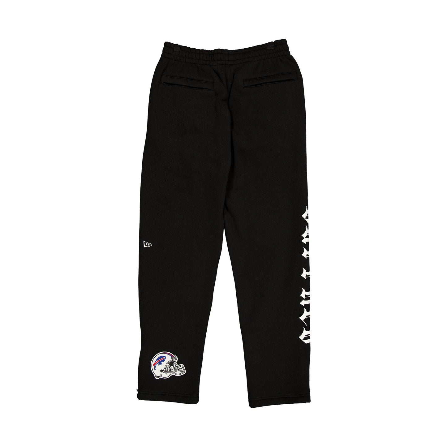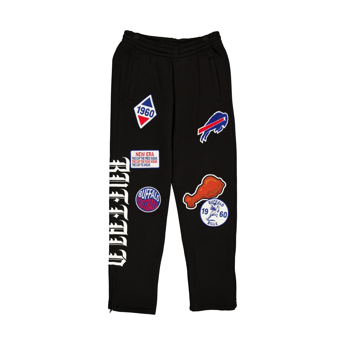 The Buffalo Bills Uptown Threads Black Sweatpants feature embroidered Bills patches throughout the pants, with a puff print gothic font wordmark at the right leg. Additional details include adjustable drawstrings at the waist and pockets.