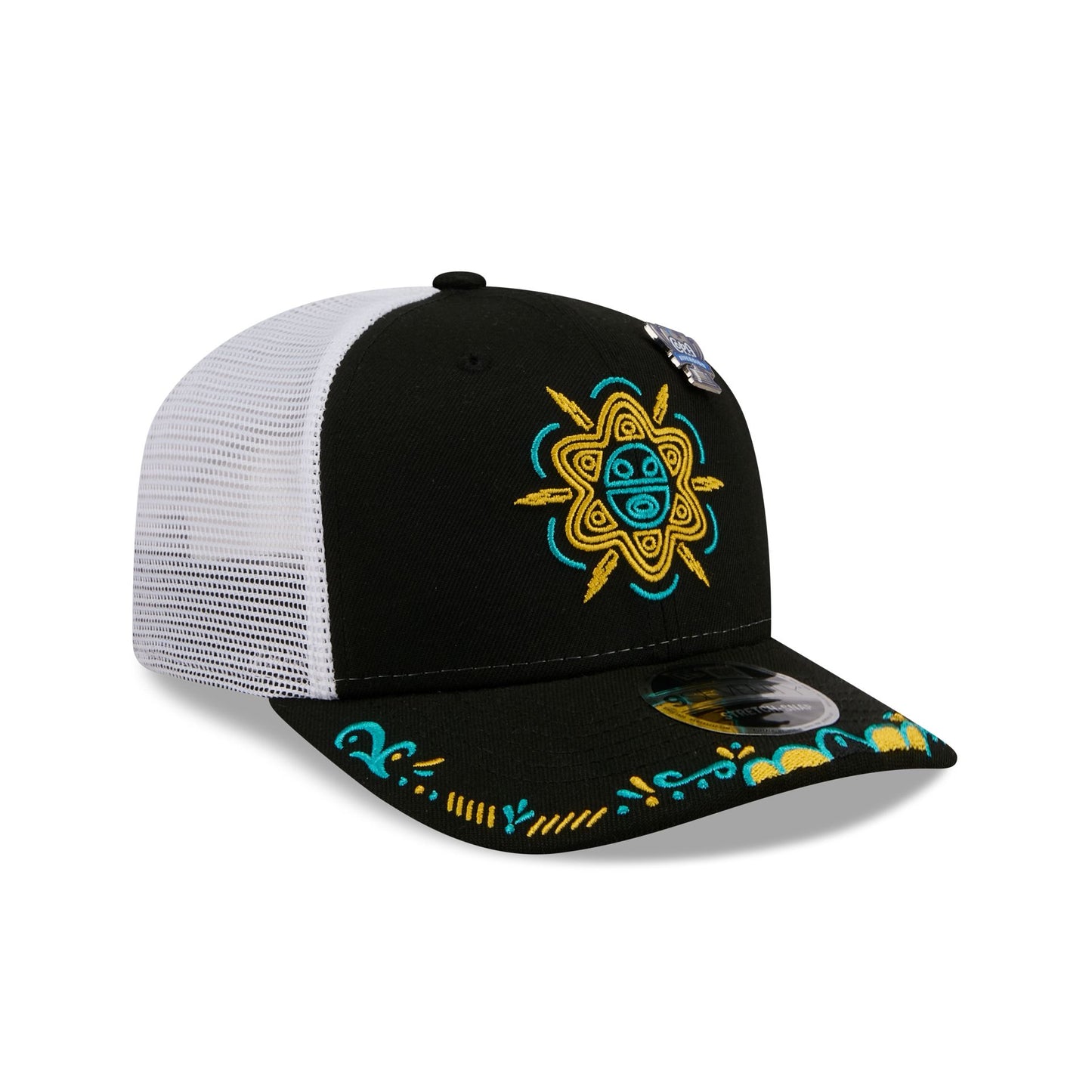 The Buffalo Bisons 2026 Copa de la Diversión 9SEVENTY Trucker features an embroidered Bisons logo at the front panels with a Copa de la Diversión pin above. Additional details include decorative embroidery at the visor, an adjustable stretch-snap closure at a mesh rear, and a gray undervisor.