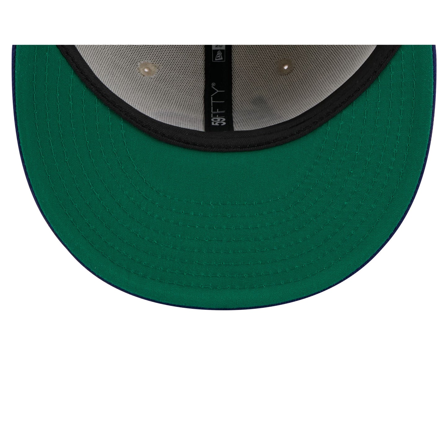The Buffalo Bisons Sandy Linen 59FIFTY Fitted Cap features an embroidered Bisons logo at the front panels with a matching MiLB Batterman logo at the rear and a green undervisor.