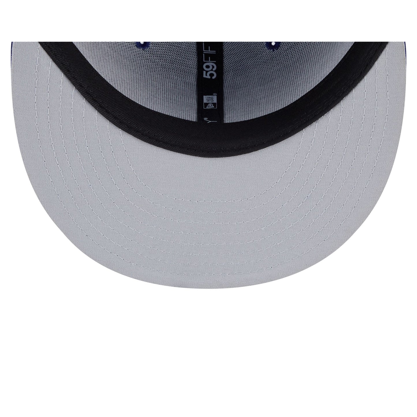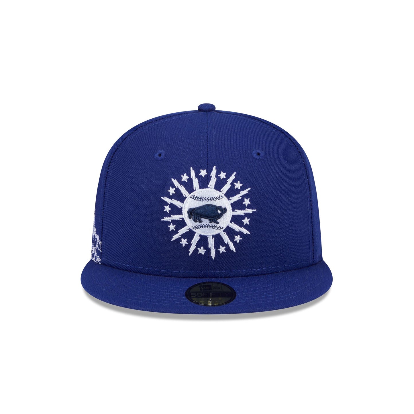 The Buffalo Bisons Theme Night Blue 59FIFTY Fitted Cap features an embroidered Bisons theme night logo at the front panels with the Buffalo skyline at the right-wear side, a matching MiLB Batterman logo at the rear, and a gray undervisor.