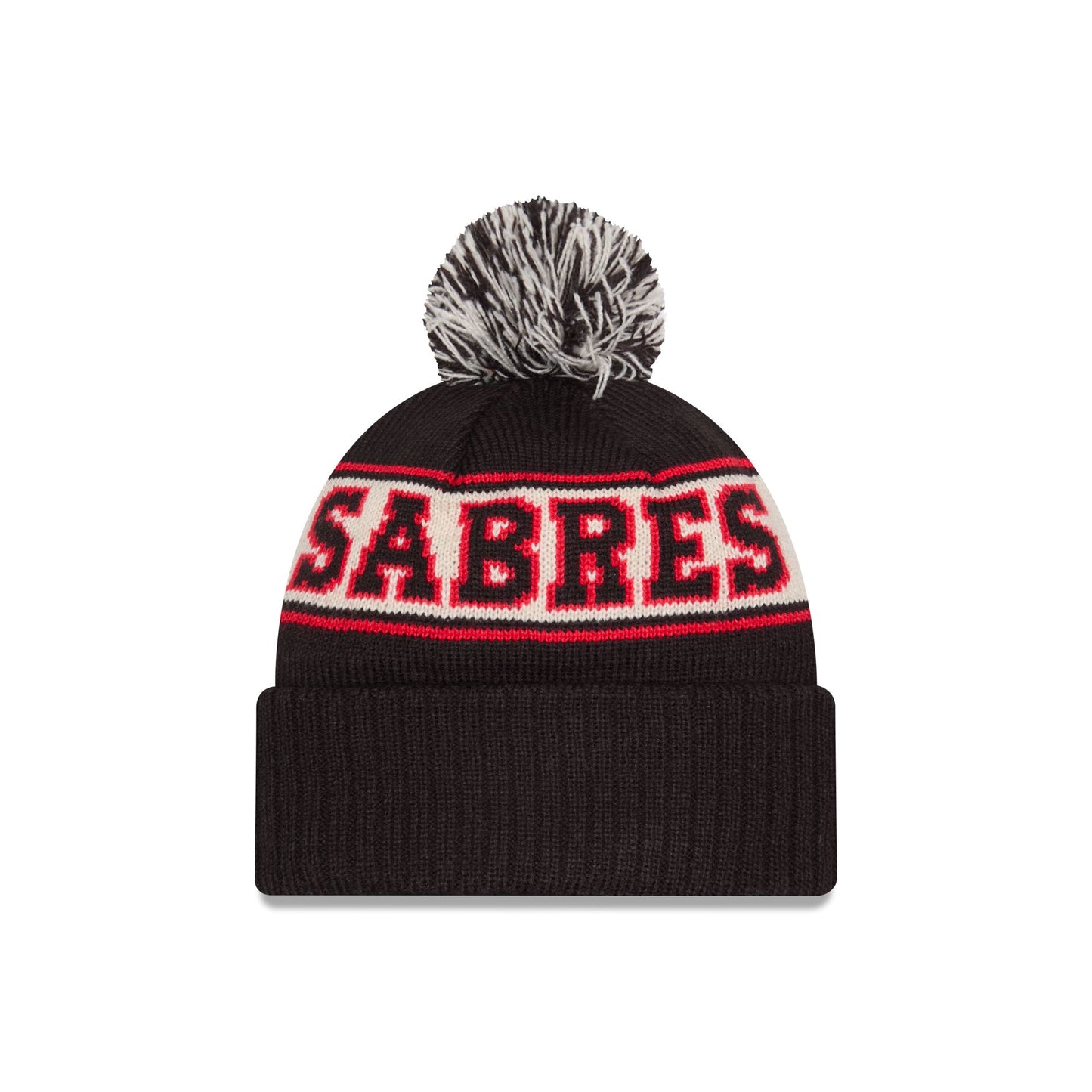 The Buffalo Sabres Alt Retro Pom Knit Hat features an embroidered Sabres logo at the front cuff with a team wordmark at the crown and a one-time removable pom.