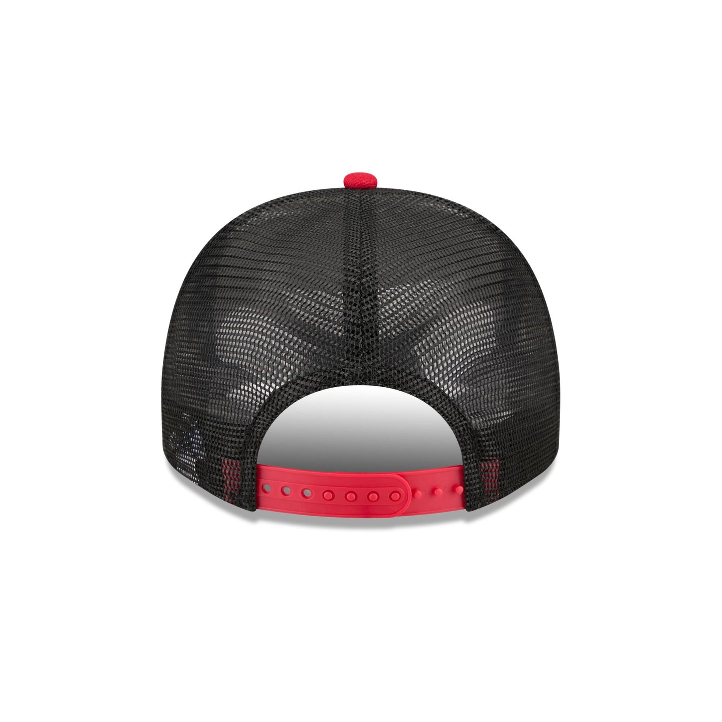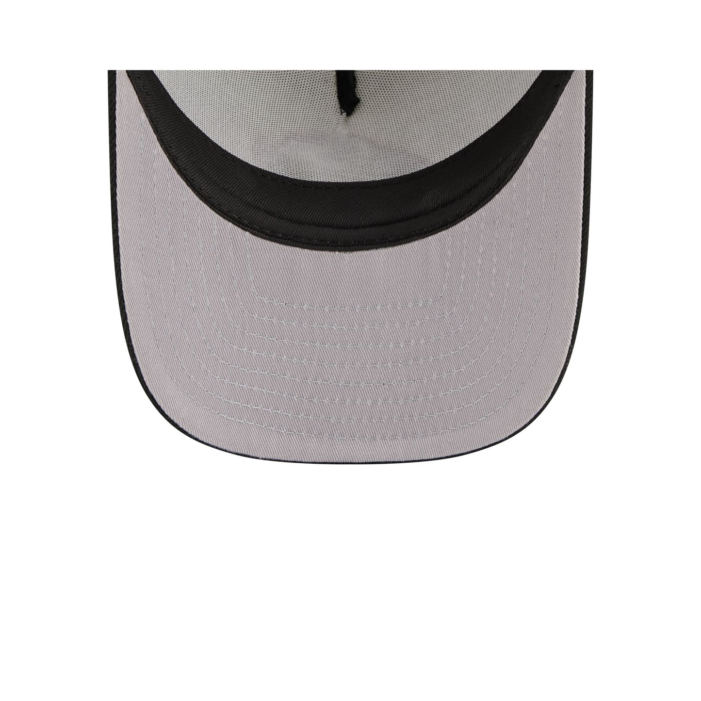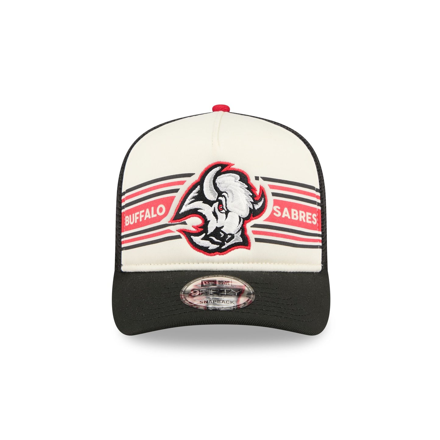 The Buffalo Sabres Alternate Banner 9FIFTY A-Frame Trucker features a embroidered Sabres alternate logo at the front panels against a screen-printed stripe at the front panels. Additional details include a snapback closure at a mesh rear and a gray undervisor.