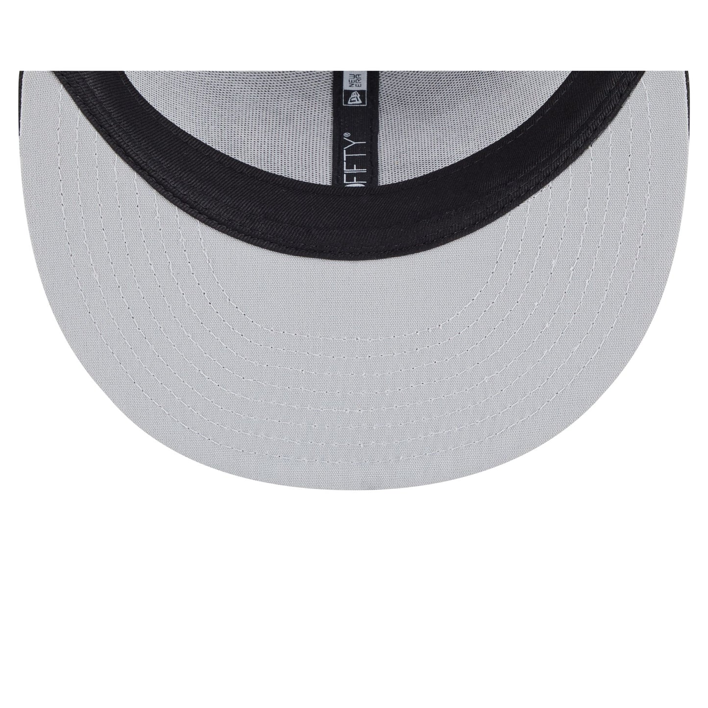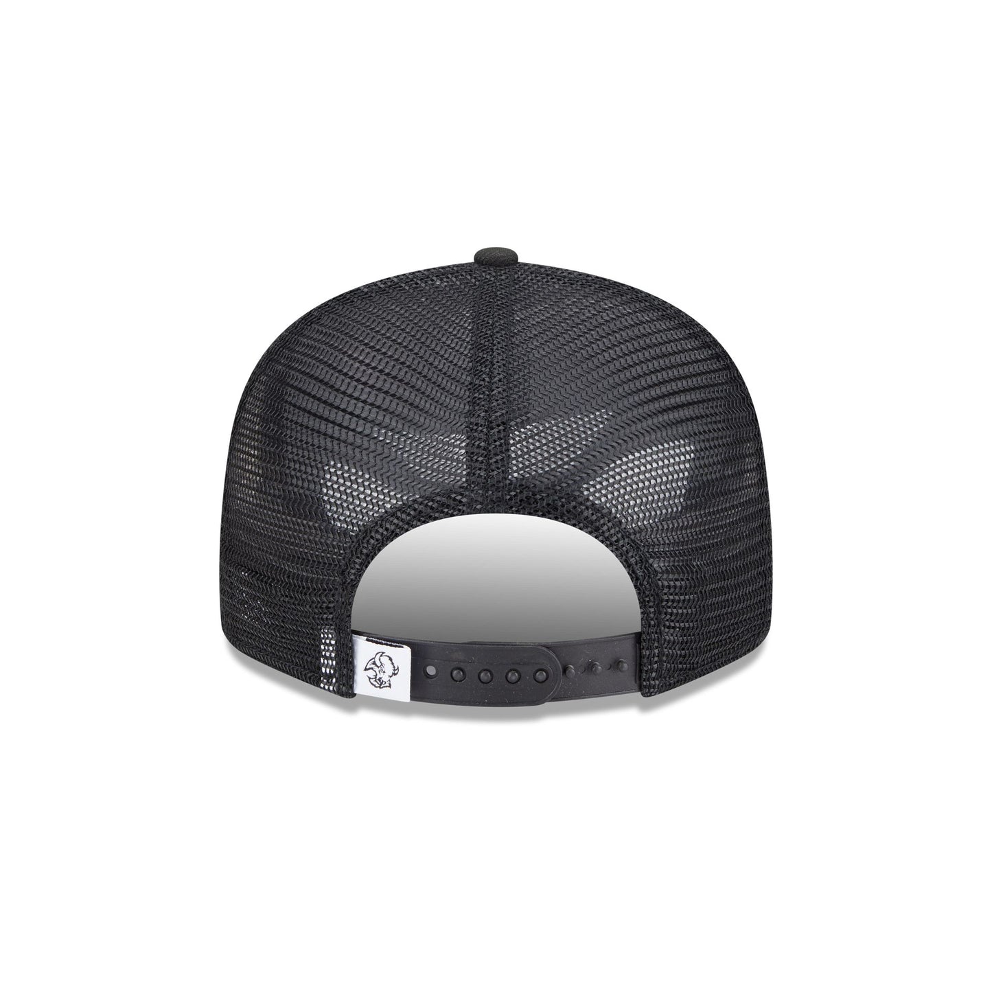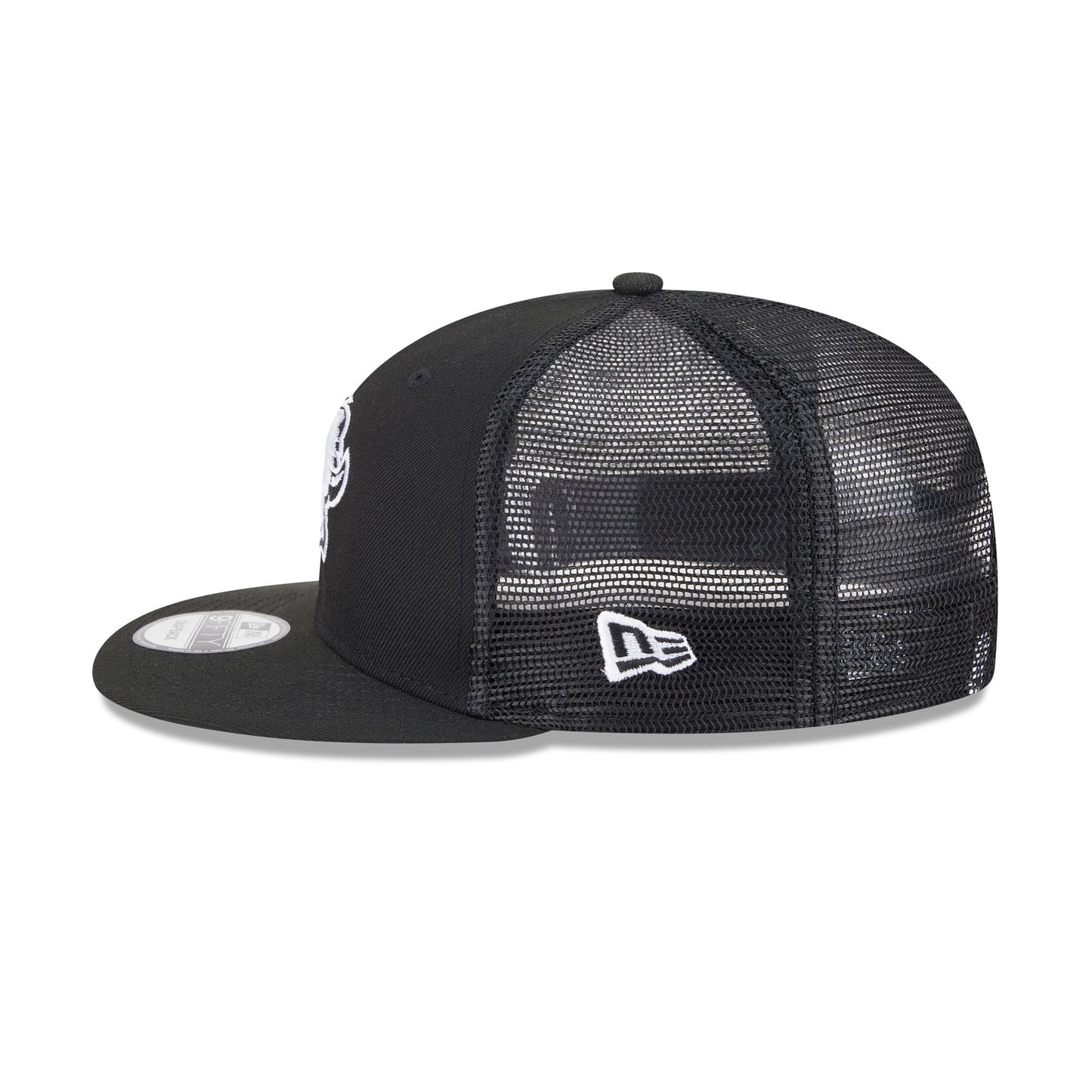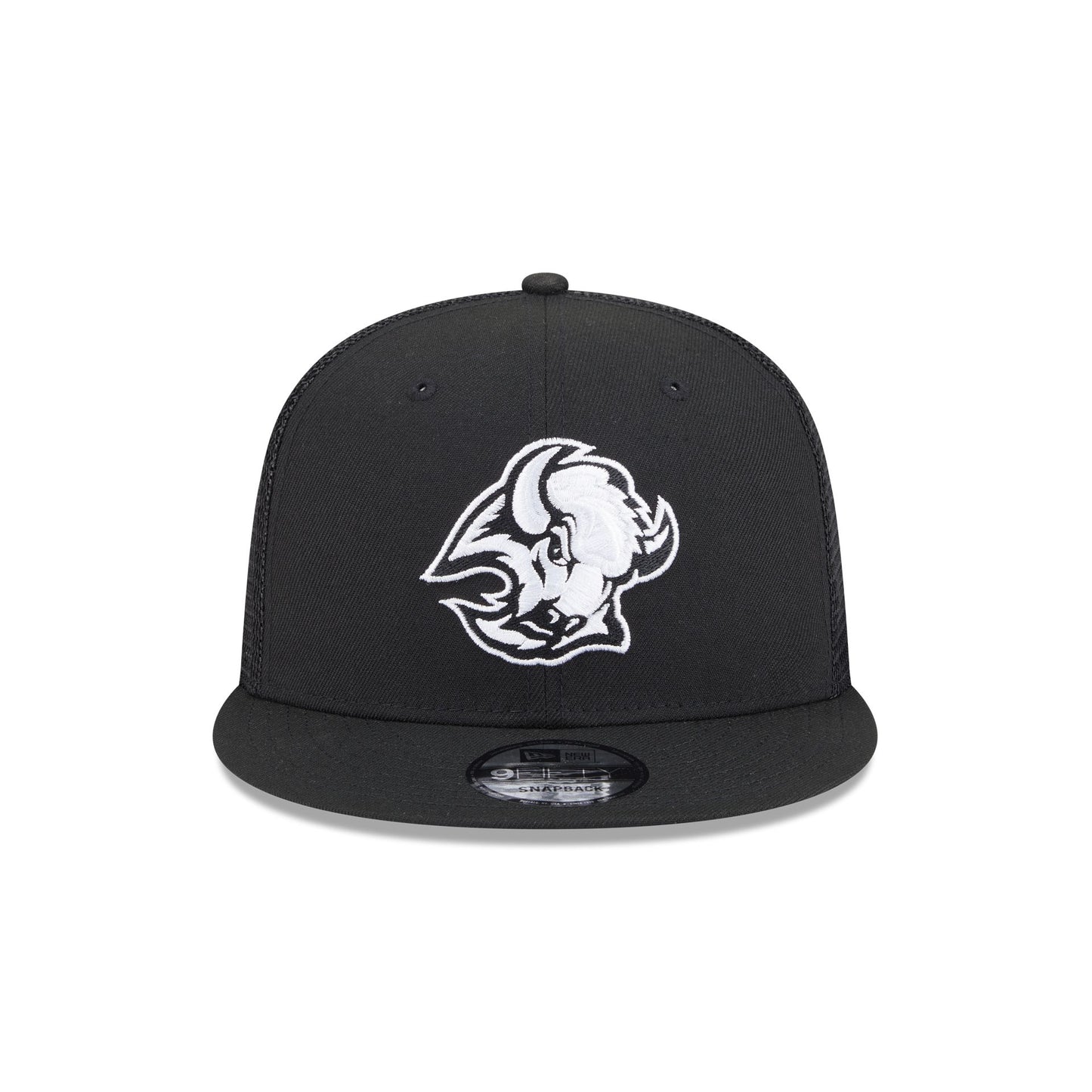 The Buffalo Sabres Black Alt 9FIFTY Trucker features an embroidered Sabres logo at the front panels with a matching woven team tag at a snapback closure at the rear and a gray undervisor.
