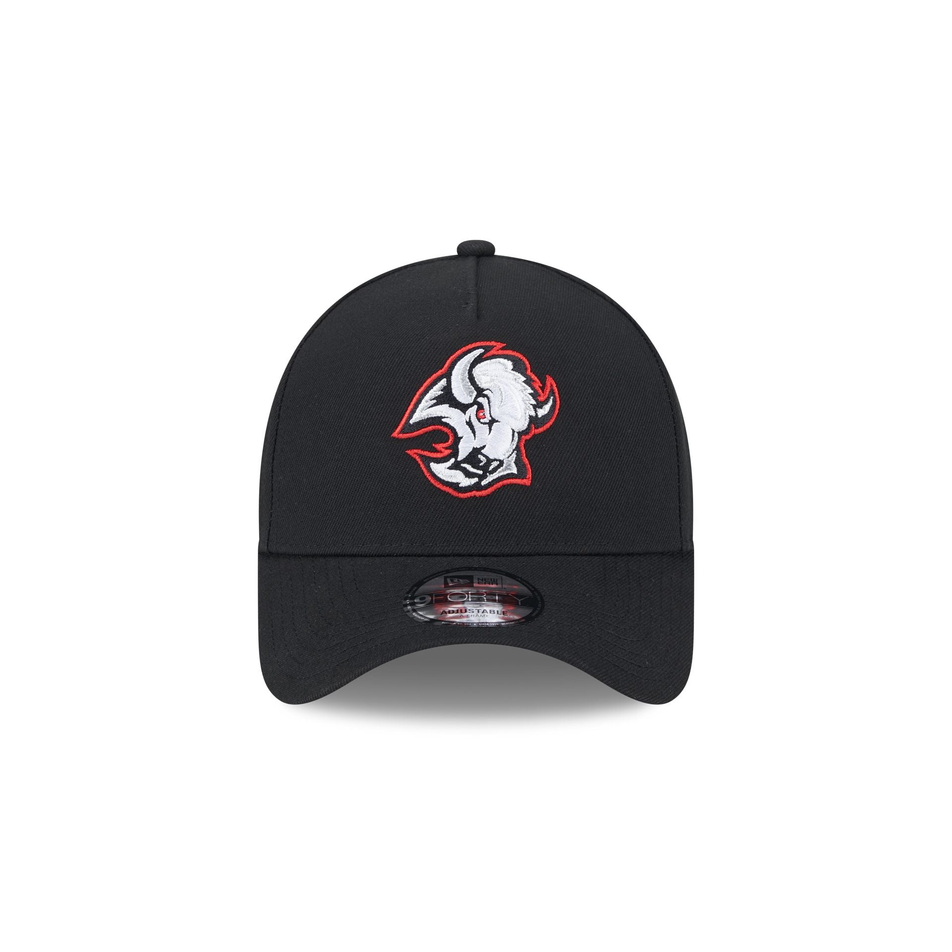 The Buffalo Sabres Black Team 9FORTY A-Frame Snapback features an embroidered Sabres logo at the front panels with a snapback closure at the rear and a gray undervisor.