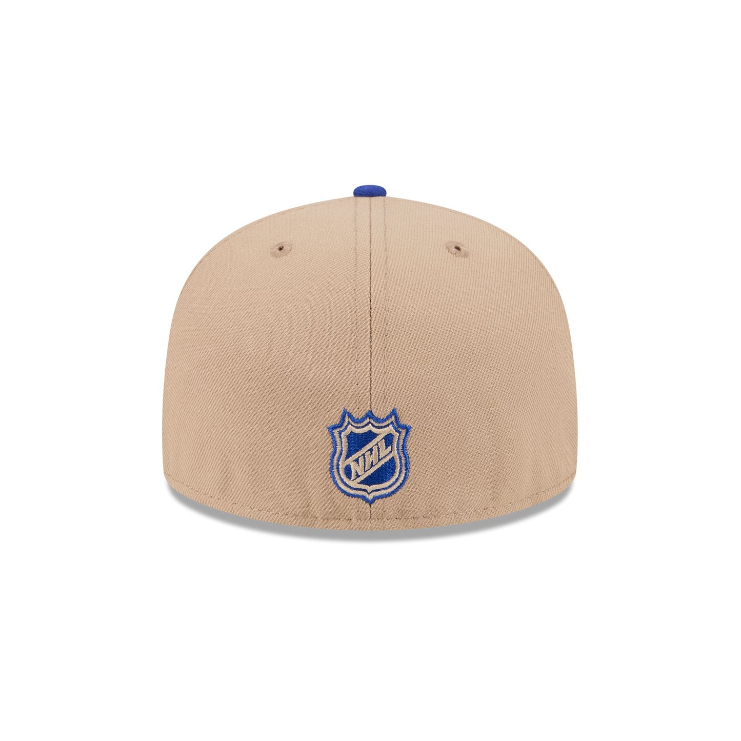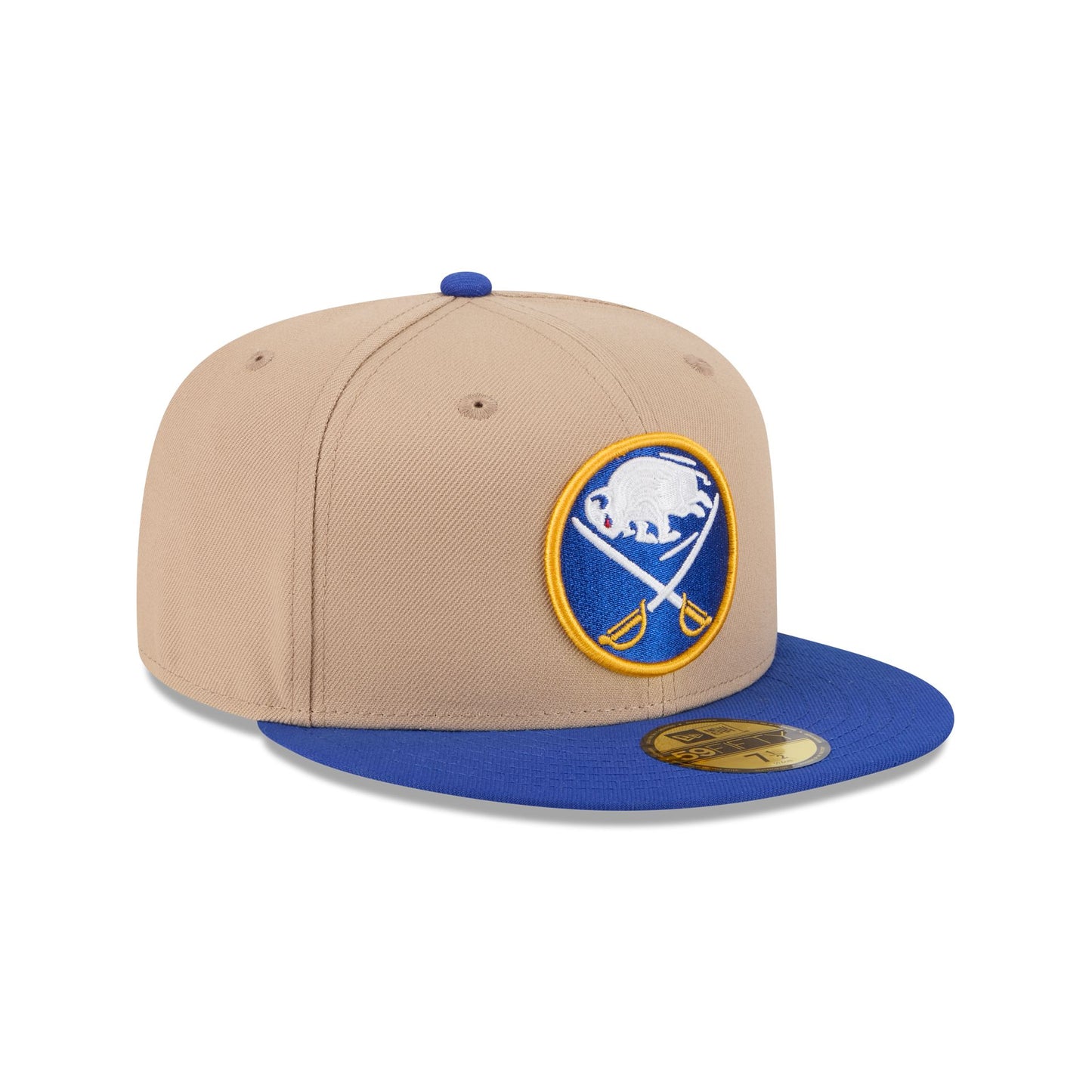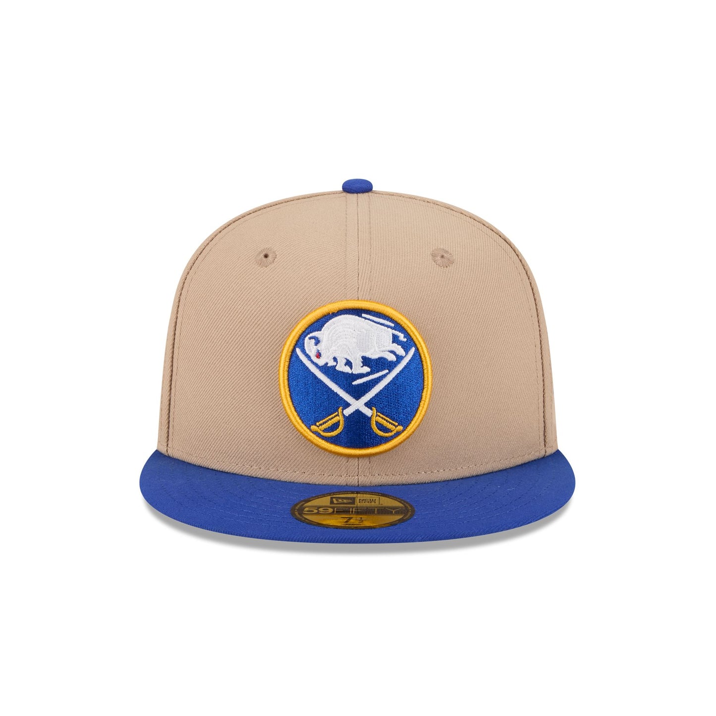 The Buffalo Sabres Camel 59FIFTY Fitted Cap features an embroidered Sabres logo at the front panels with a matching NHL Shield at the rear, a team color visor, and a gray undervisor.