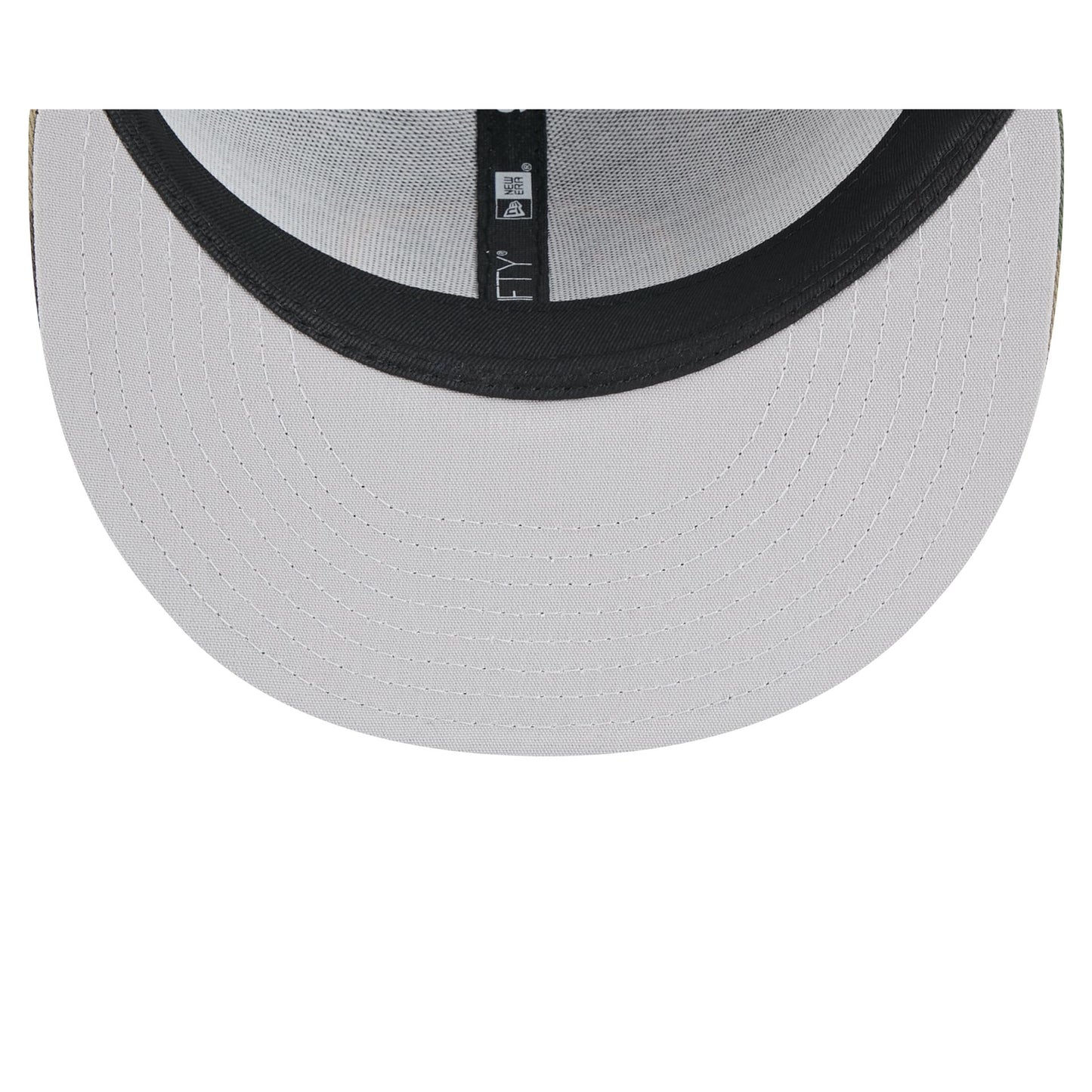 The Buffalo Sabres Camo 9FIFTY Trucker features an embroidered Sabres logo at the front panels with a team tag on a snapback closure at a mesh rear and a gray undervisor.