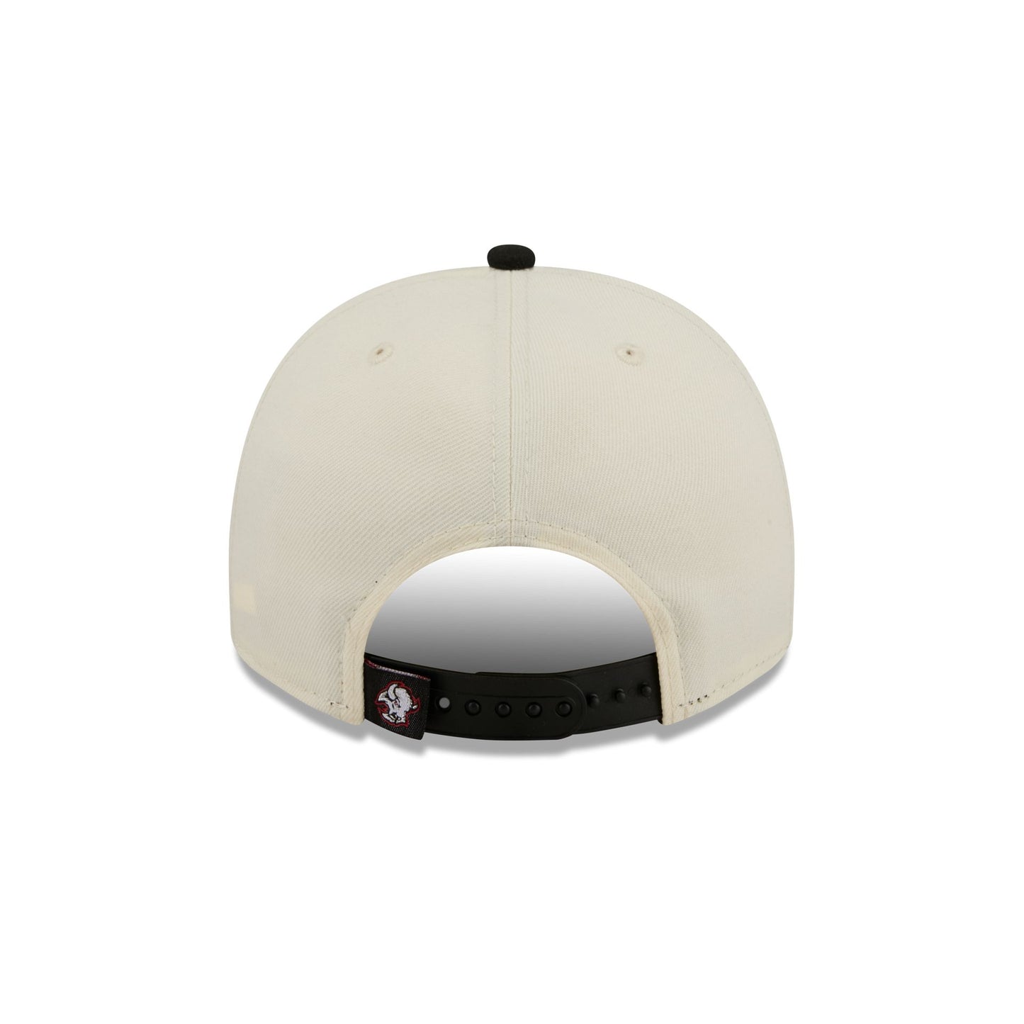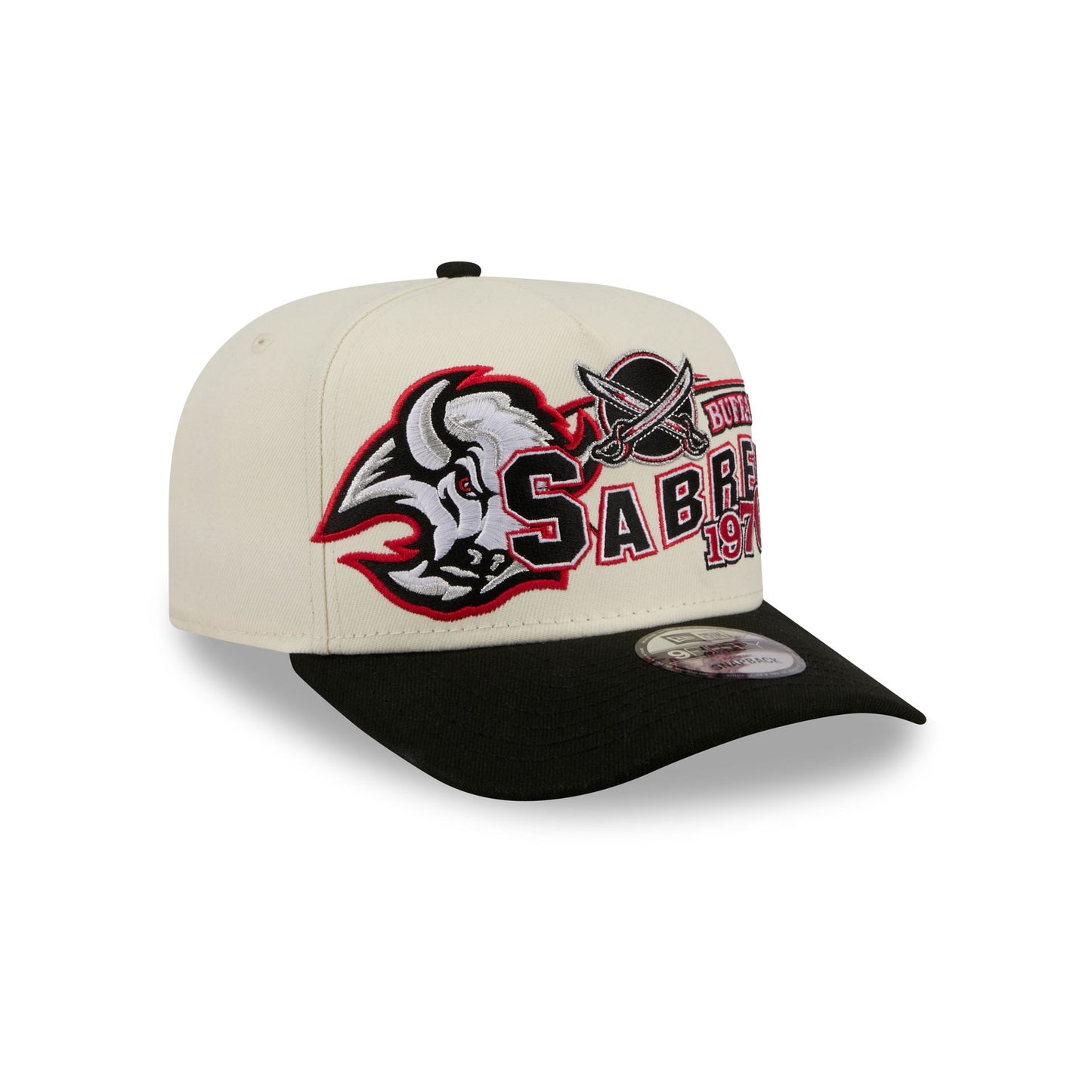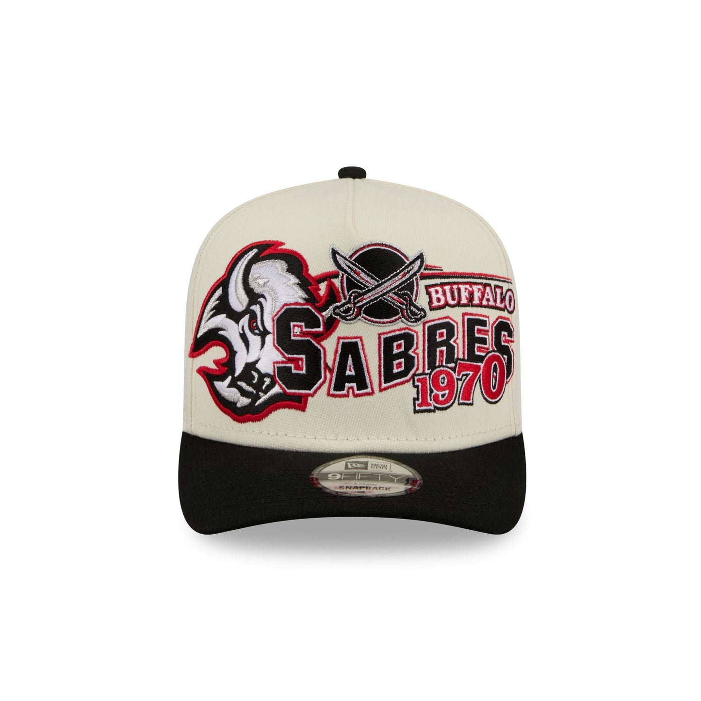 The Buffalo Sabres Chrome White Classic 9FIFTY A-Frame Snapback features an embroidered Sabres graphic at the front panels with an adjustable snapback closure at the rear and a green undervisor.