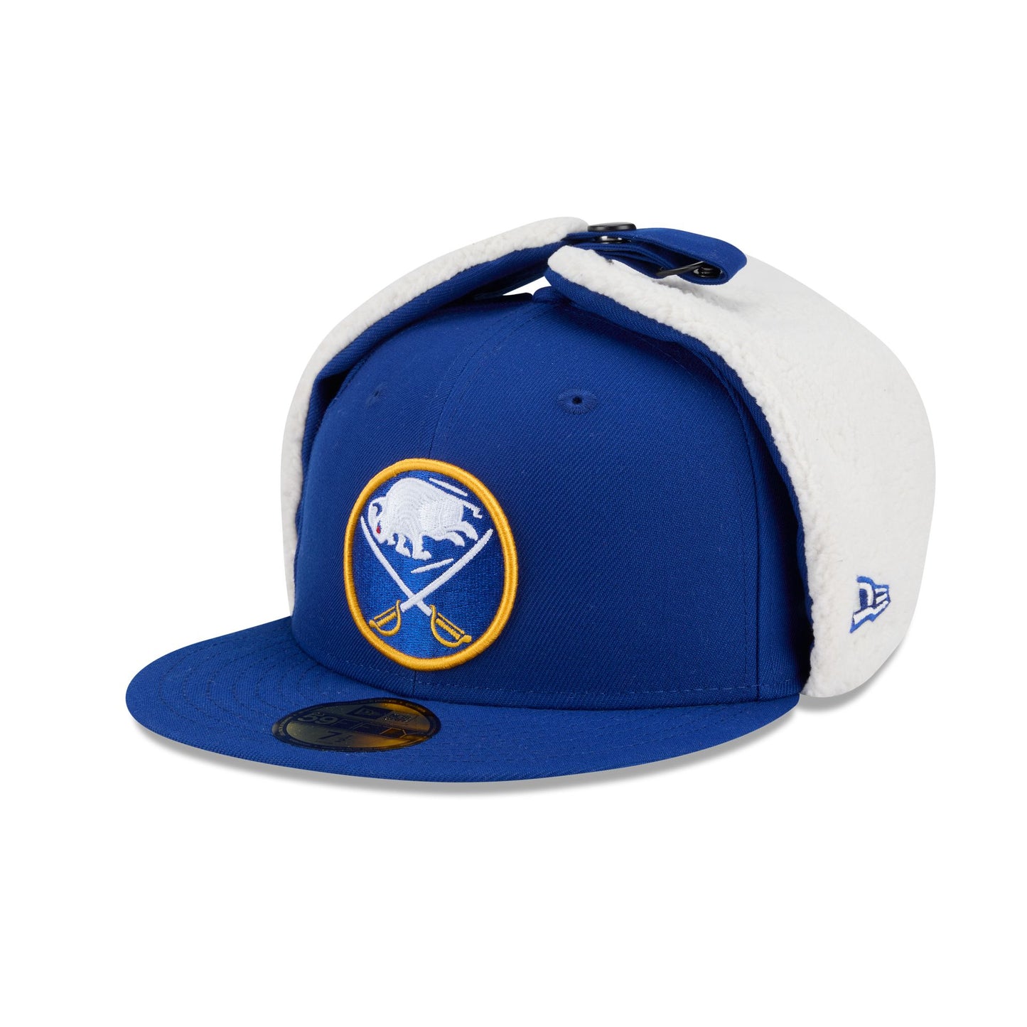 The Buffalo Sabres Classic Dog Ear 59FIFTY Fitted Cap features an embroidered Sabres logo at the front panels with sherpa ear covers with a snap button closure. Additional details include the NHL Shield logo at the rear and a gray undervisor.