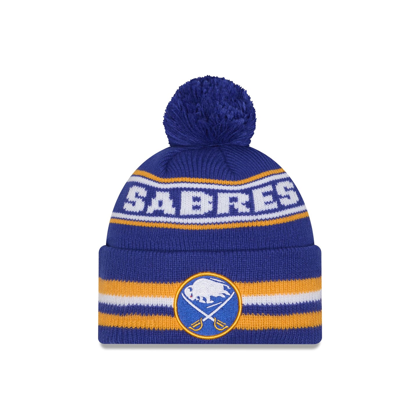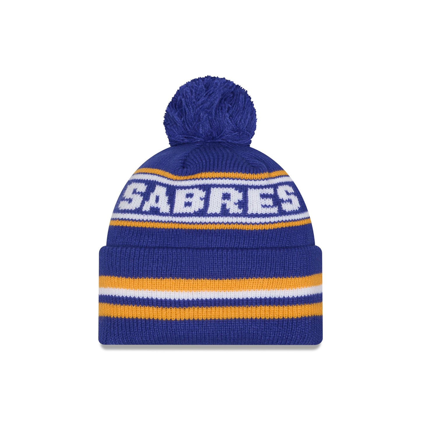 The Buffalo Sabres Classic Pom Knit Hat features an embroidered Sabres logo at the front cuff with a wordmark at the crown and a one-time removable pom.