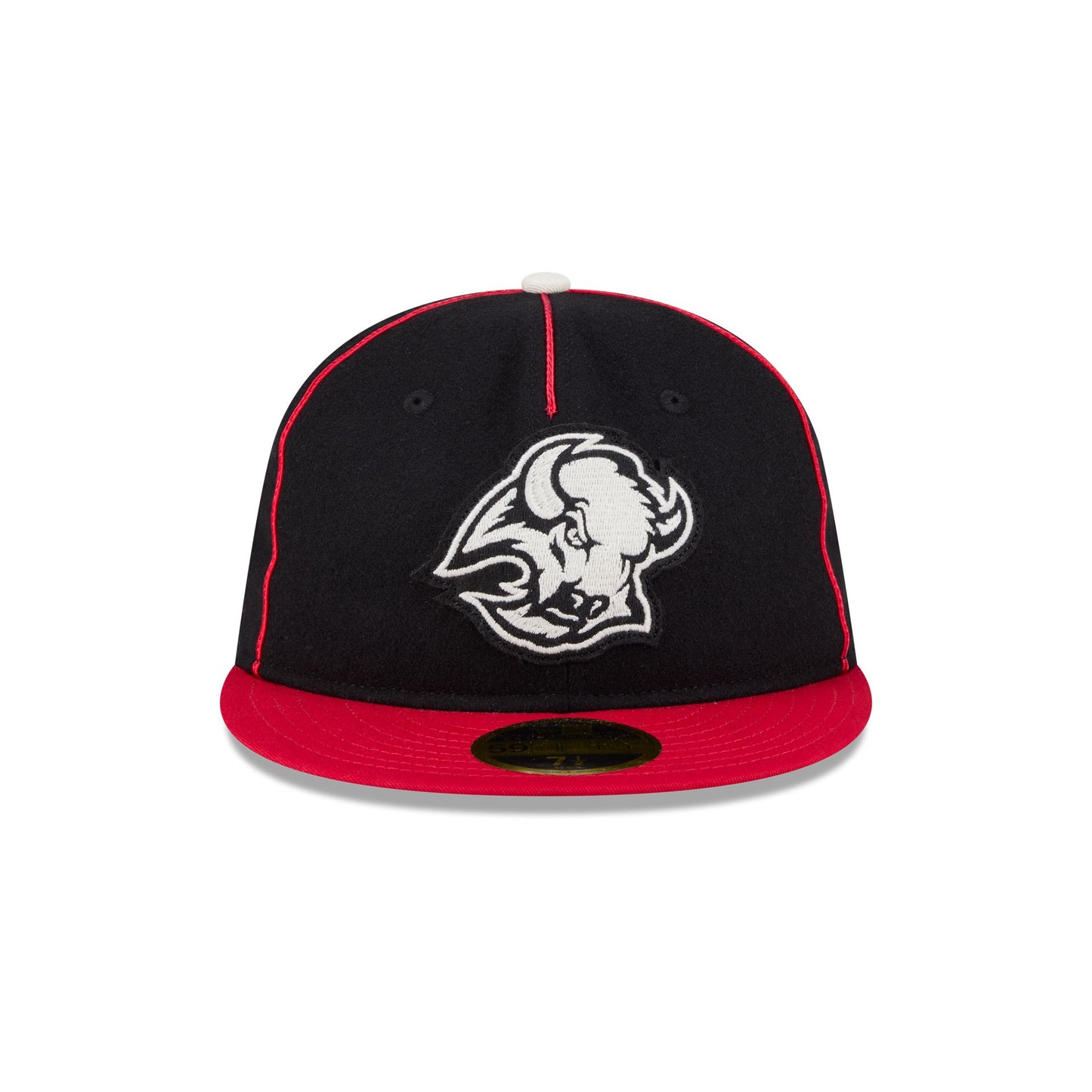 The Buffalo Sabres Felt Logo Retro Crown 59FIFTY Fitted Cap features an embroidered Sabres felt logo at the front panels with the NHL Shield at the right-wear side. Additional details include a team color piping at the crown and a green undervisor.