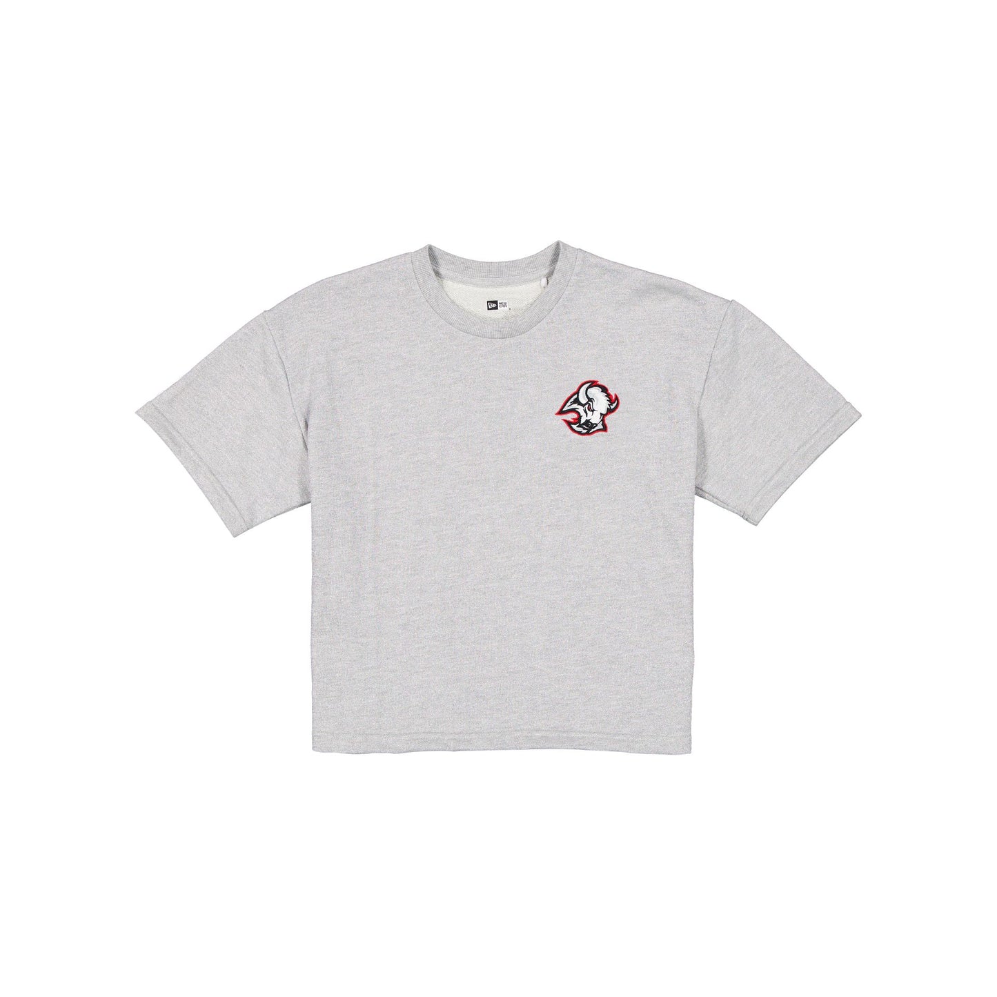 The Buffalo Sabres Glam Game Women's Cropped Heather Gray T-Shirt features an embroidered Sabres logo at the left chest with a cropped fit.