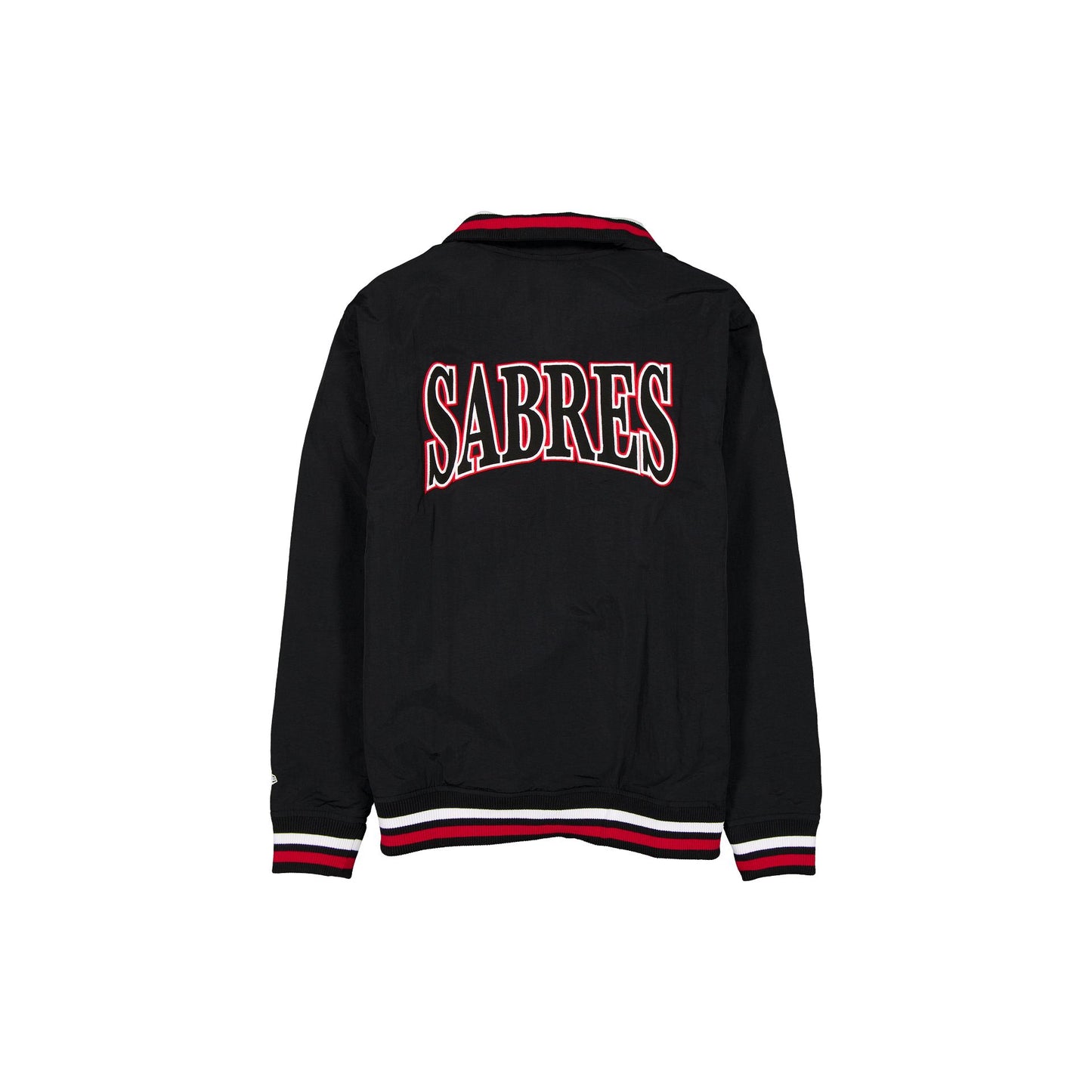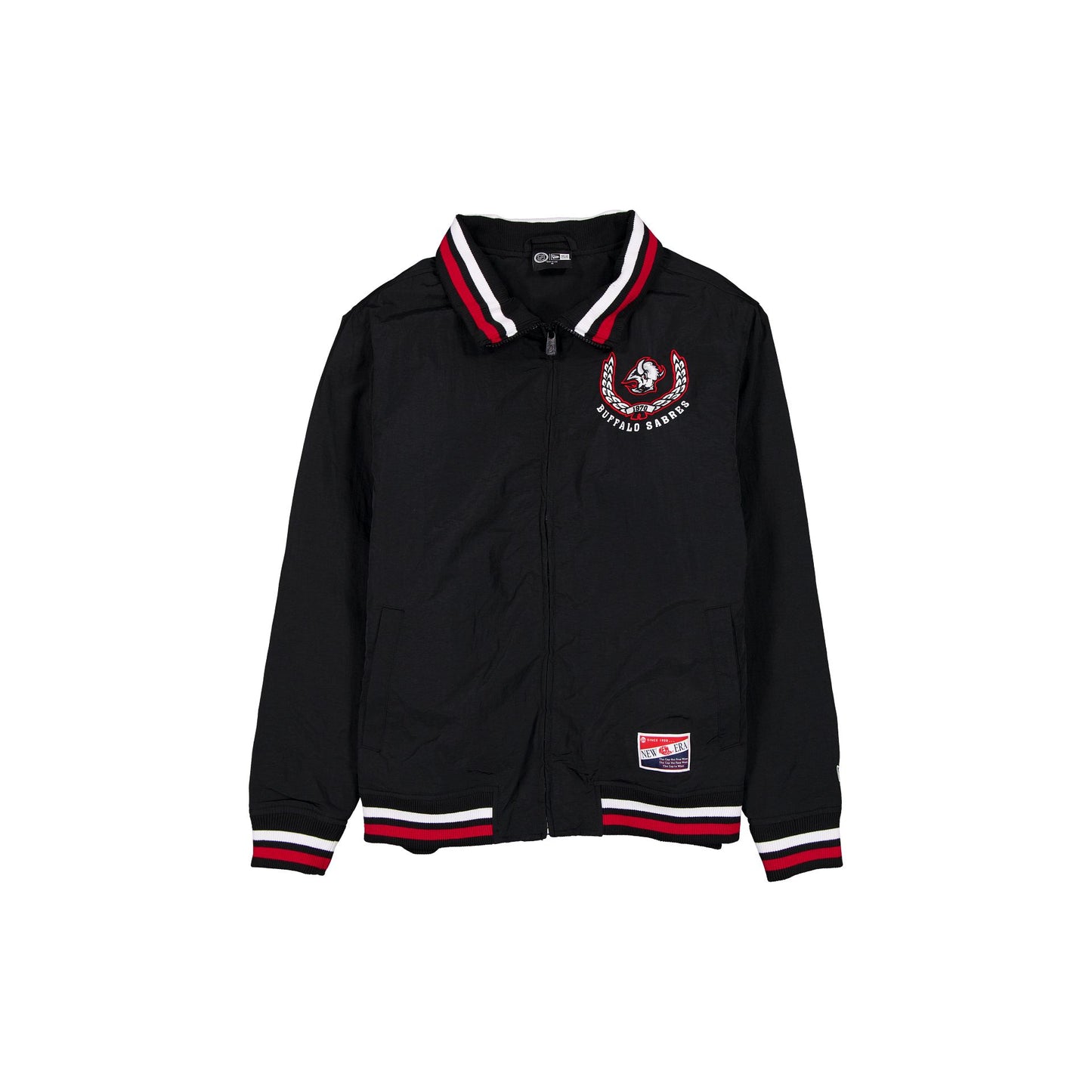 The Buffalo Sabres Throwback Laurel Jacket features an embroidered Sabres laurel graphic at the left chest with a wordmark at the rear. Additional details include a woven New Era jock tag at the left hip, front pockets, a zipper closure, and a quilted lining.