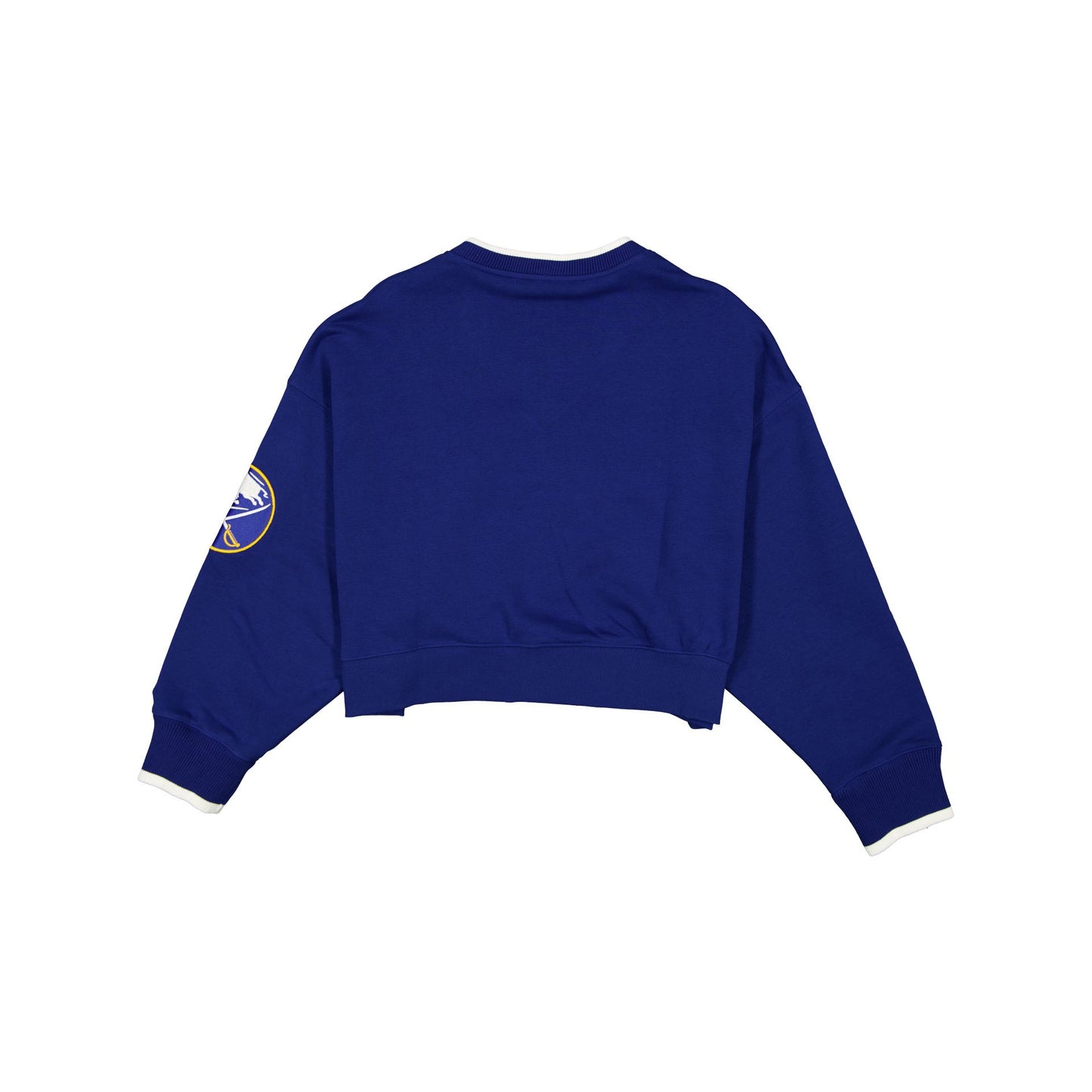 The Buffalo Sabres Throwback Prep Women's Cropped Crewneck features a screen-printed Sabres wordmark at the chest with an embroidered script wordmark below. Additional details include an embroidered logo at the left arm and a cropped fit.