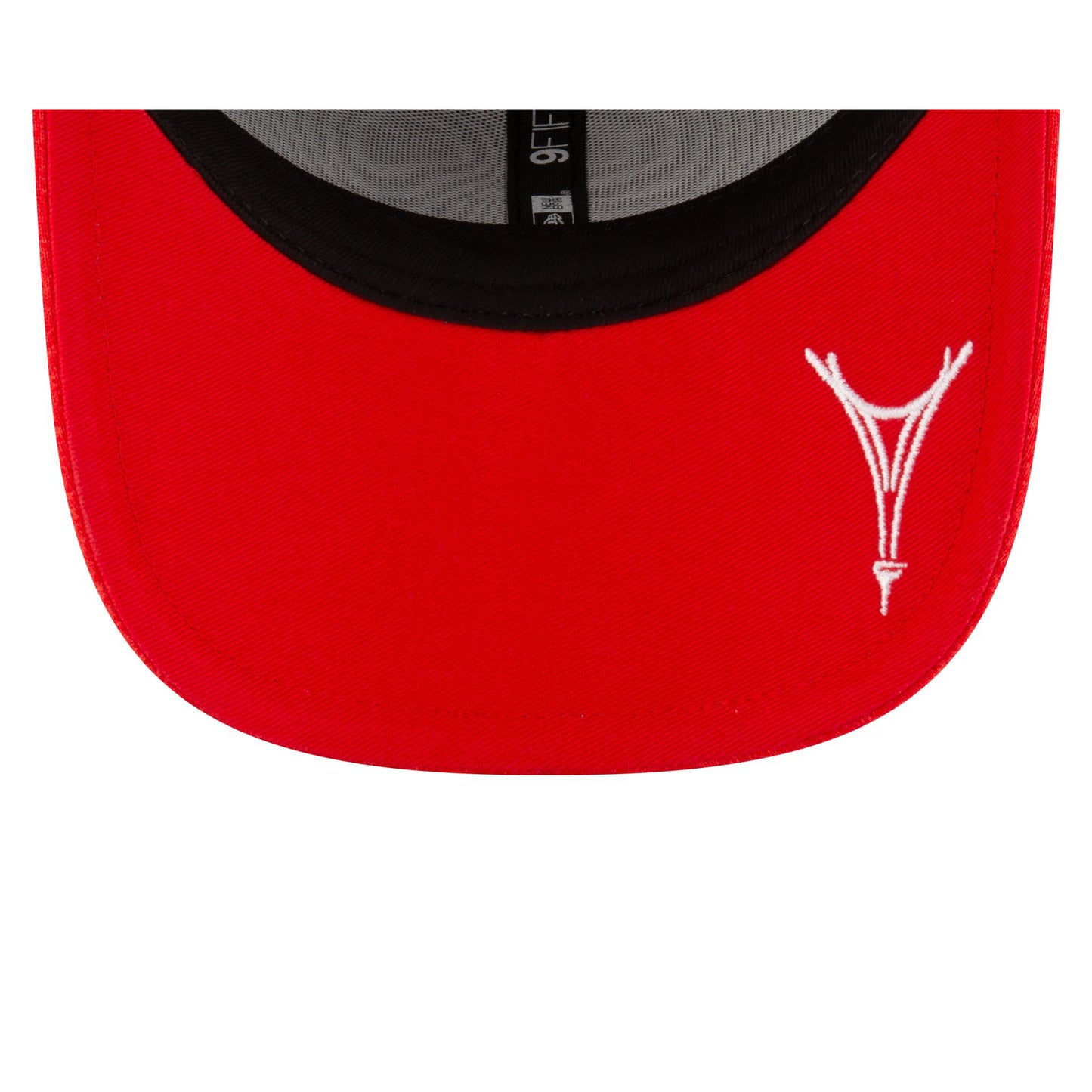 The BWT Alpine F1 Team 2024 Vegas Race Special Ocon 9FIFTY Pre-Curve Snapback features a heat seal liquid metal Alpine logo at the front panels with the driver's number at the visor and stars on all panels. Additional details include sponsor logos throughout the cap and a snapback closure at the rear.