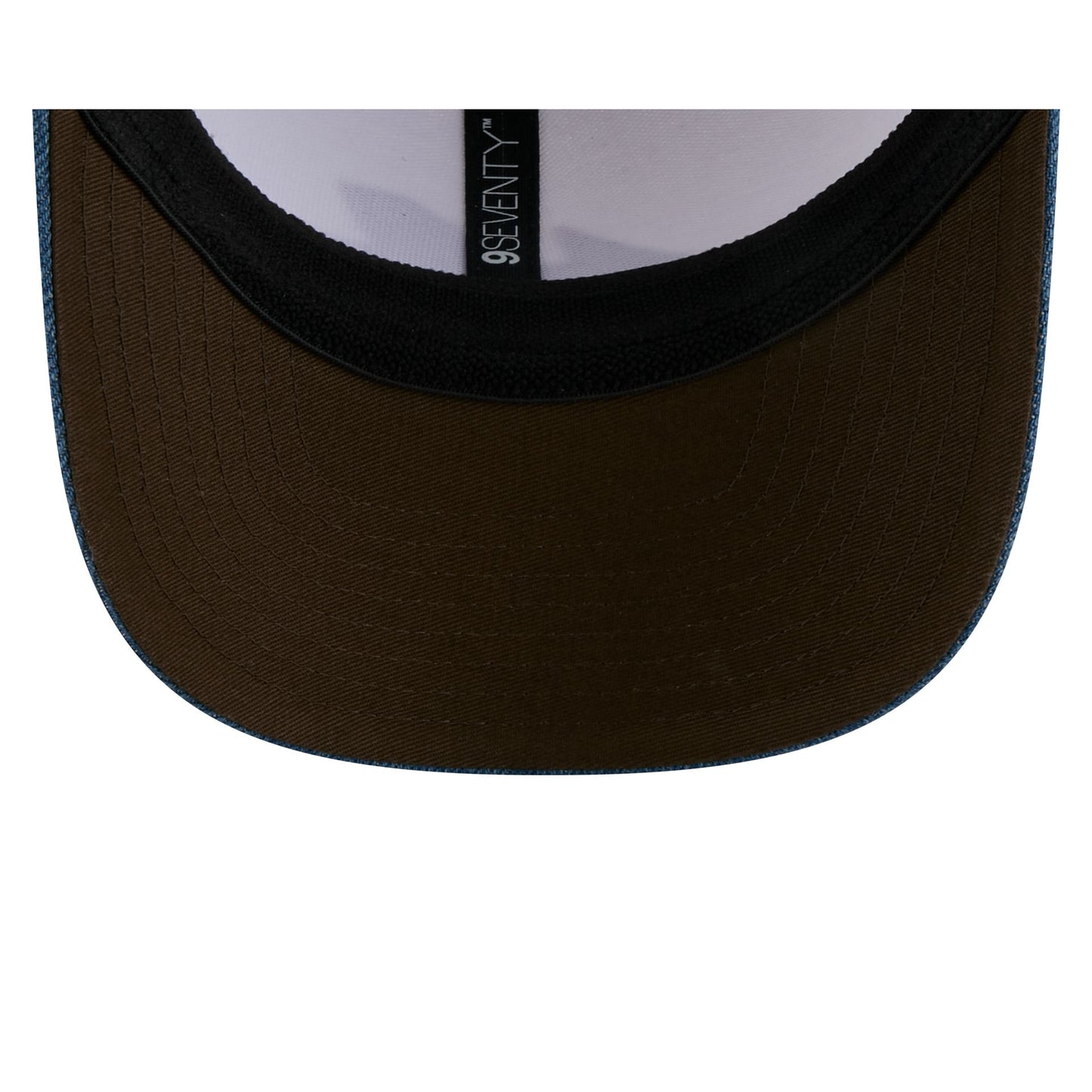 The BWT Alpine F1 Team 2025 Austin Race Special 9SEVENTY Stretch-Snap features a woven leather BWT Alpine F1 Team logo at the front panels with a matching 2025 Austin, TX and BWT patch at the right-wear side. Additional details include a denim visor, an adjustable stretch-snap closure at the rear and a brown undervisor.