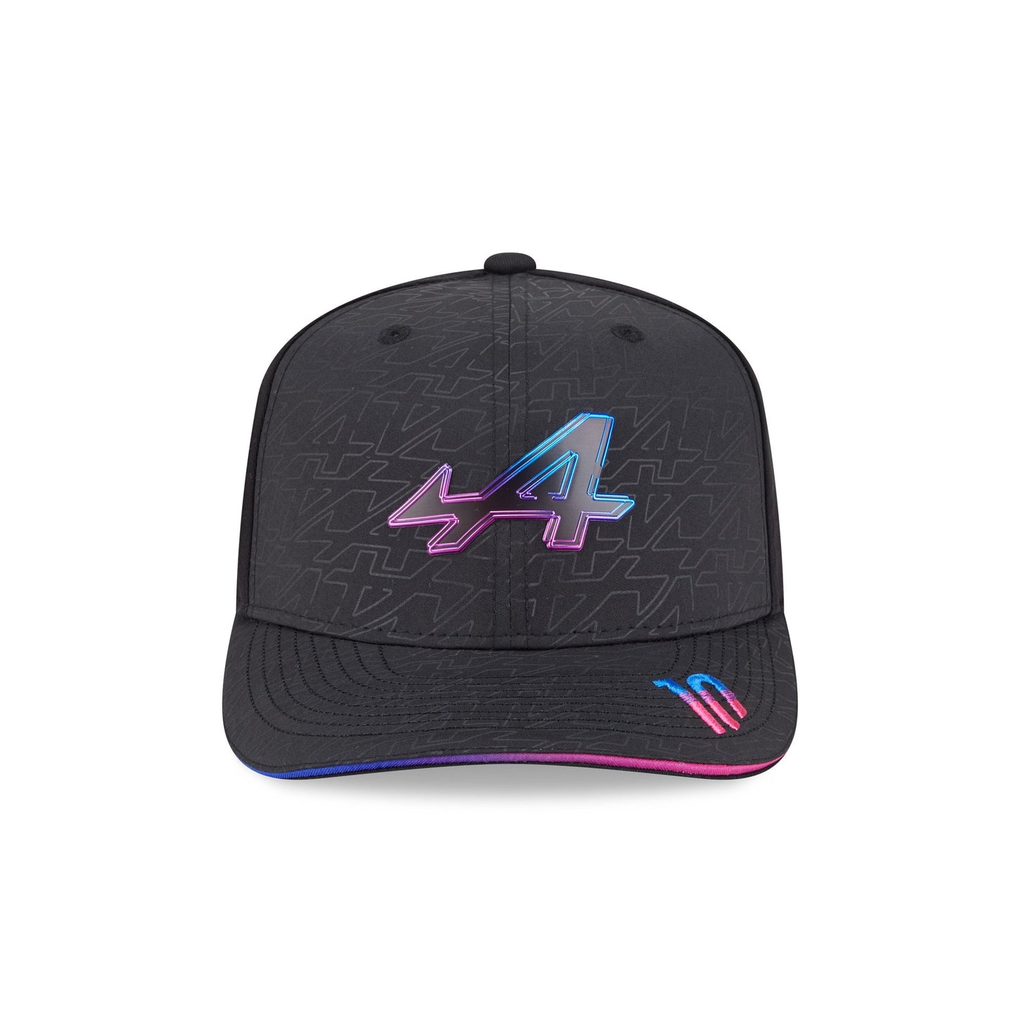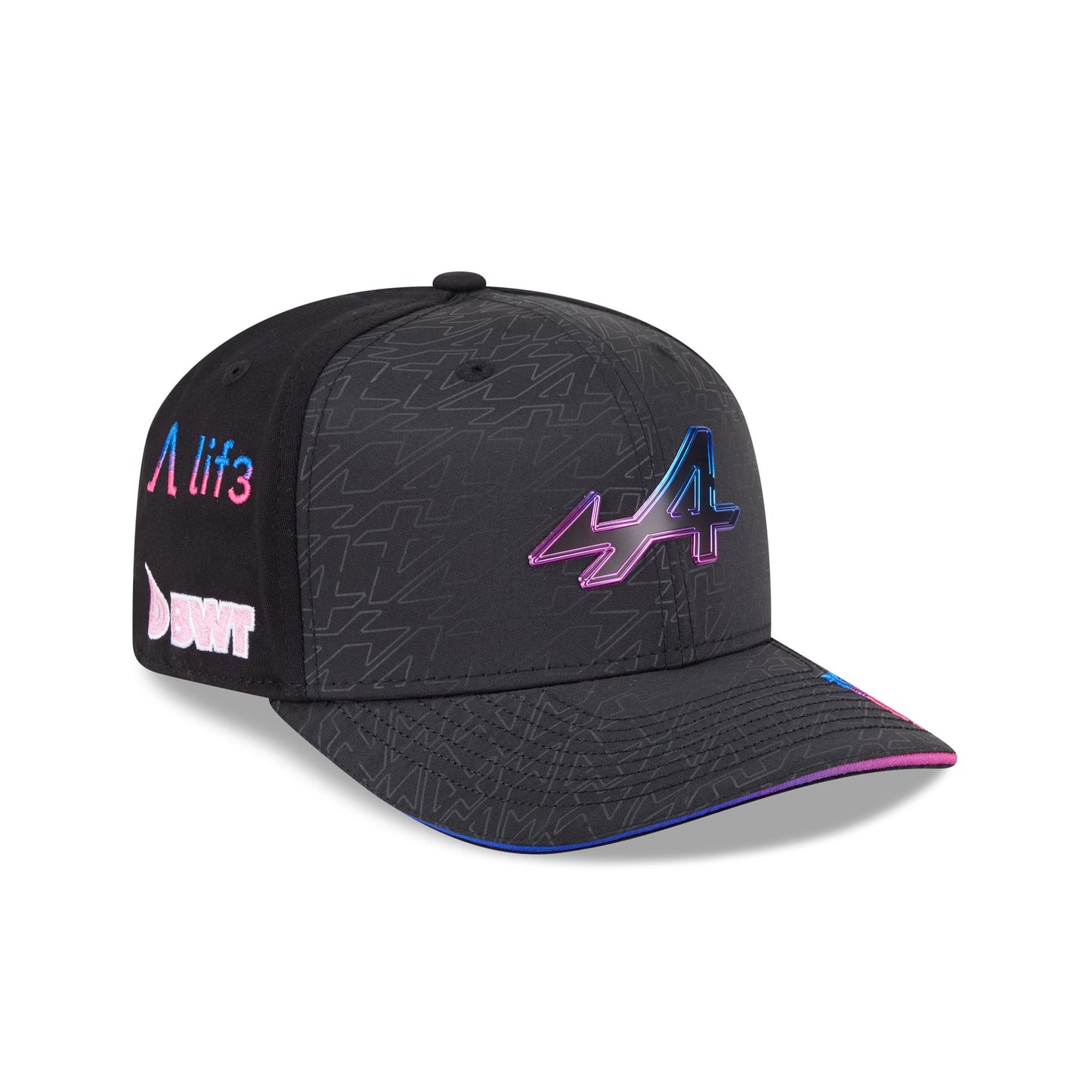 The BWT Alpine F1 Team 2025 Las Vegas Race Special Pierre Gasly 9SEVENTY Stretch-Snap features a raised iridescent BWT Alpine F1 Team logo at the front panels with the driver's number at the visor. Additional details include sponsor logos throughout the cap with an adjustable stretch-snap closure at the rear.