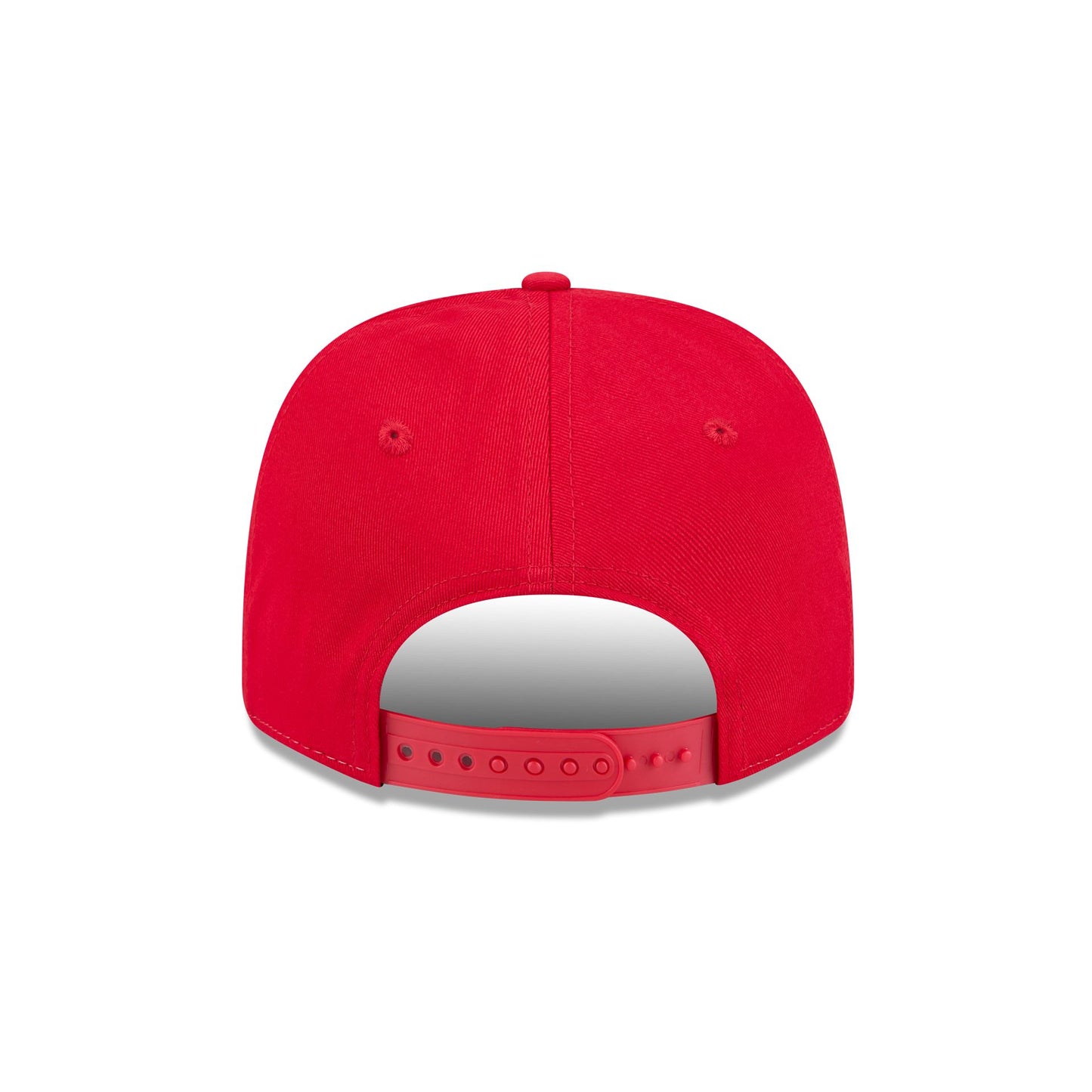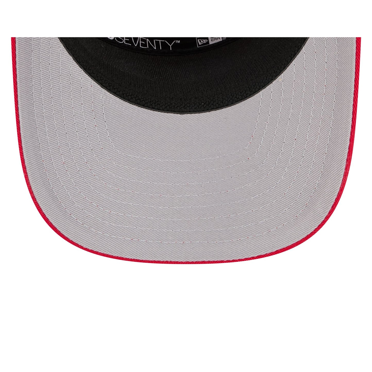 The Calgary Flames Split Panel 9SEVENTY Stretch-Snap features an embroidered Flames logo at the front panel with a split crown construction and a rope at the visor. Additional details include an adjustable stretch-snap closure at the rear and a gray undervisor.