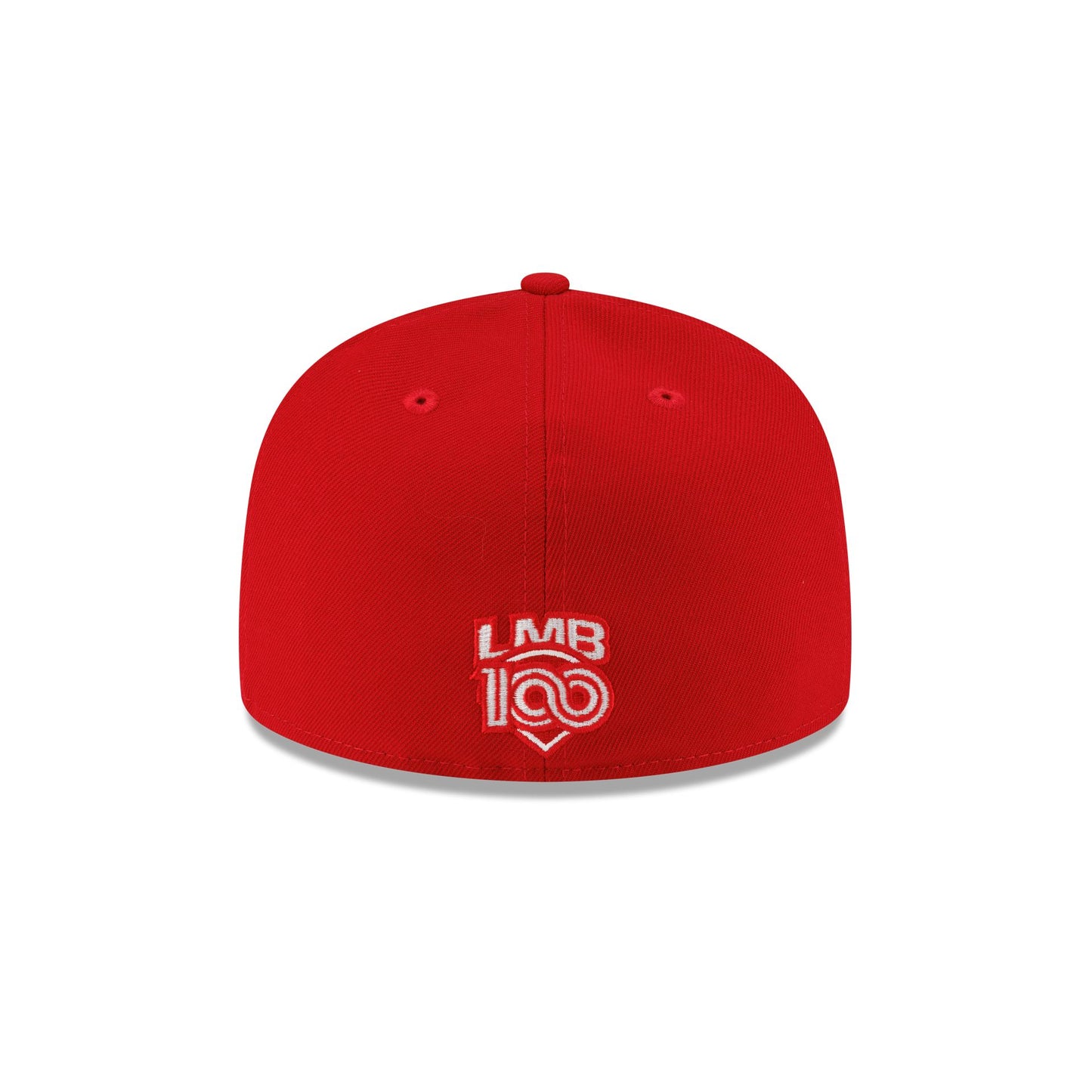 The Caliente de Durango Retro 59FIFTY Fitted Cap features an embroidered Caliente retro logo at the front panels with a 100th Anniversary LMB logo at the rear and a green undervisor.