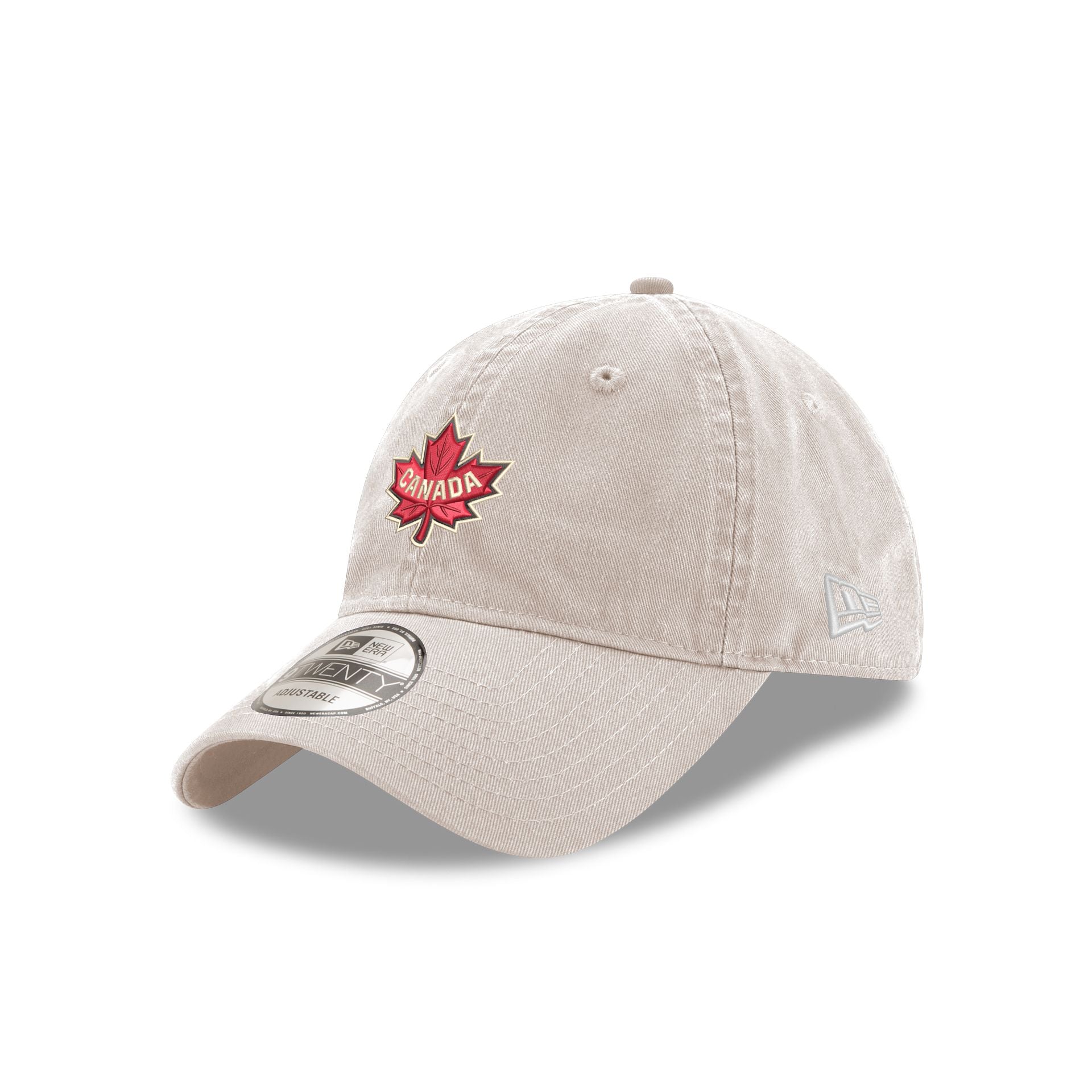 The Canada 2025 4 Nations Face-Off Stone 9TWENTY Adjustable Cap features an embroidered Canada logo at the front panels with a 2025 4 Nations Face-Off patch at the right-wear side and an adjustable D-Ring closure at the rear.