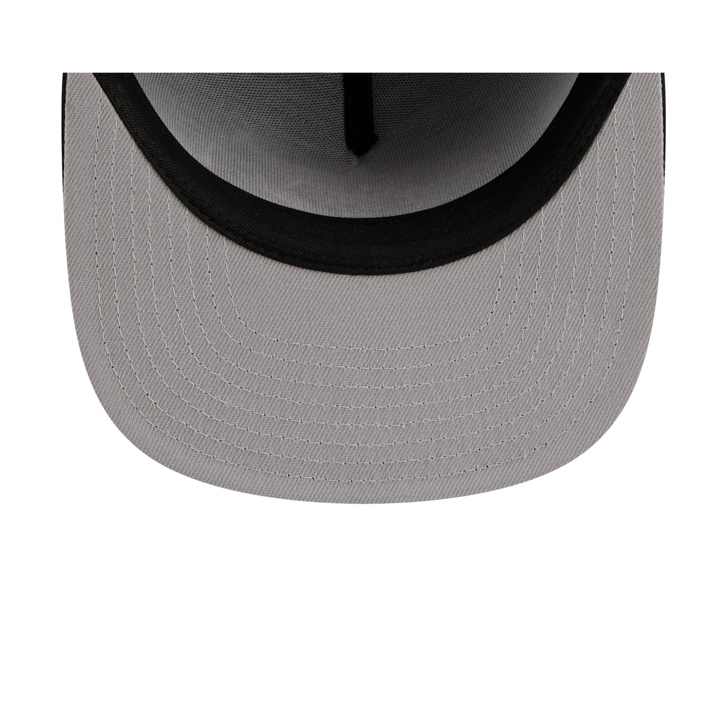 The Carolina Hurricanes Grunge Plaid 9FIFTY A-Frame Adjustable Cap features an embroidered Hurricanes logo at the front panel with a matching wordmark above an adjustable metal clasp closure at the rear, a black visor, and a gray undervisor.