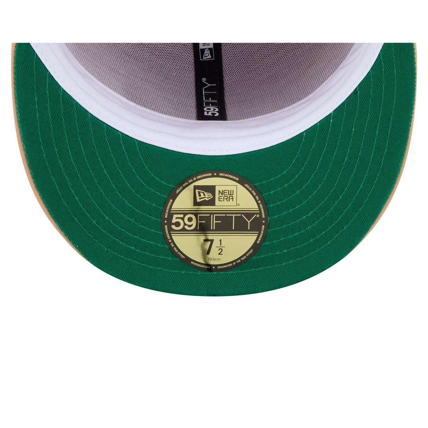 The Carolina Hurricanes Leather Visor 59FIFTY Fitted Cap features an embroidered Hurricanes logo at the front panels with a cream leather visor. Additional details include an NHL Shield logo at the rear and a green undervisor with leather accents throughout.