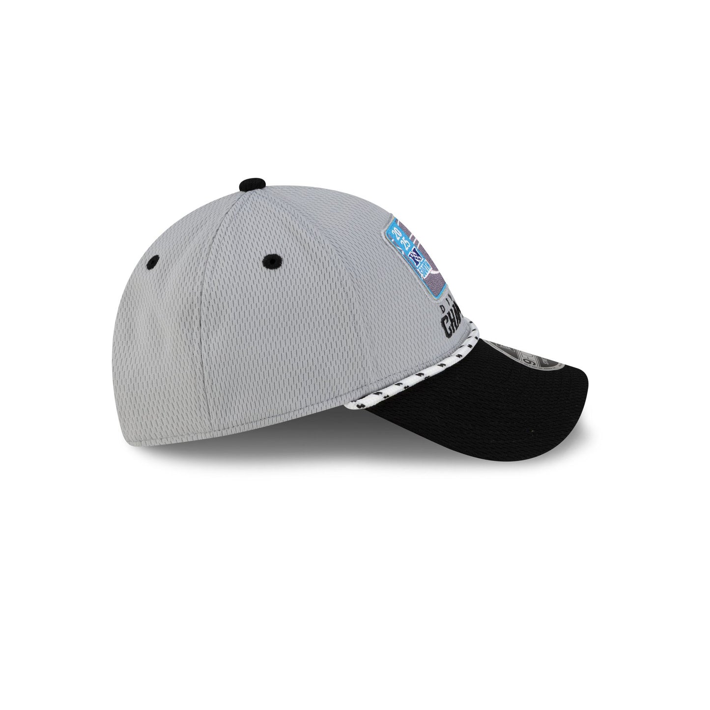 The Carolina Panthers 2025 Division Champion Locker Room 9FORTY Stretch-Snap Cap features an embroidered Panthers NFC South patch above a Division Champions wordmark at the front panels with an NFL Shield above a stretch-snap closure at the rear, a black visor, and a gray undervisor.