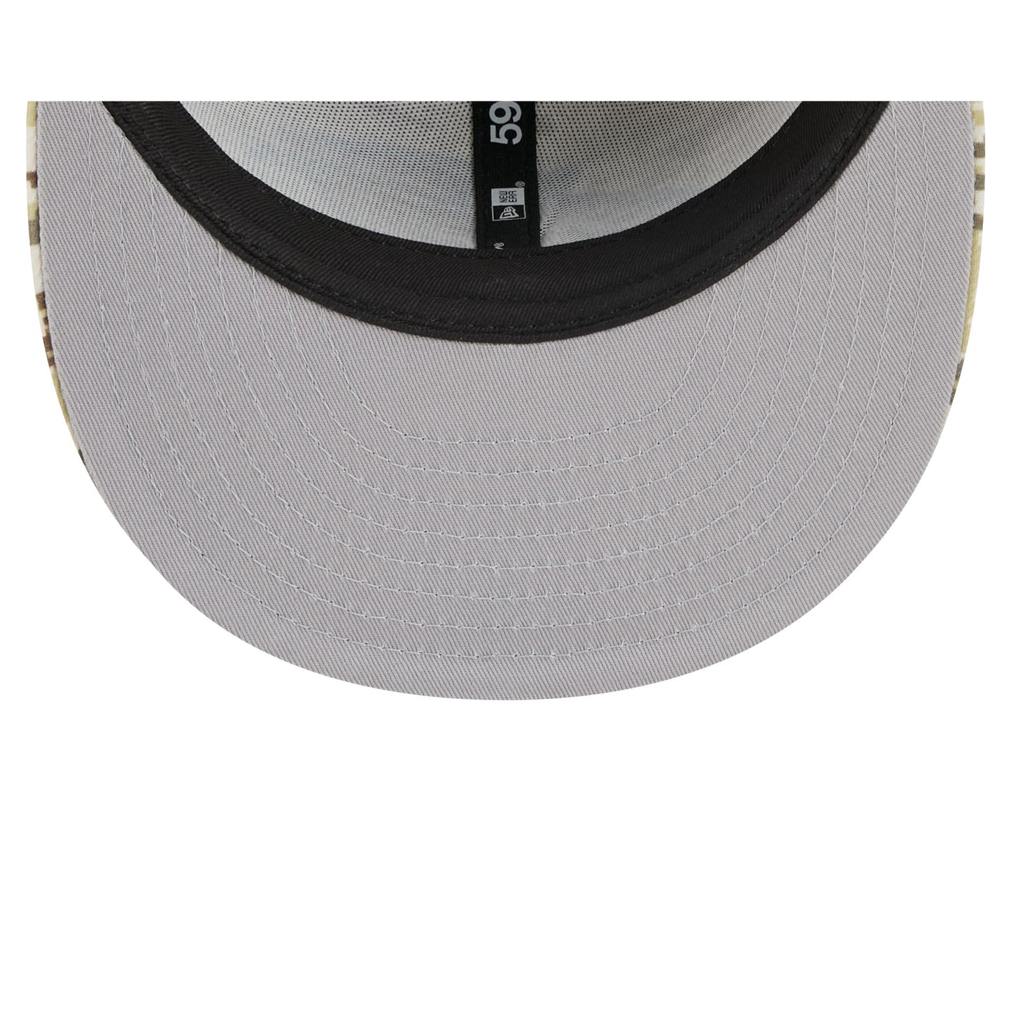 The Carolina Panthers 2025 Salute to Service Fan Gear 59FIFTY Fitted Cap features an embroidered Panthers logo at the front panels with the official NFL Salute to Service patch at the rear, an American flag patch at the right-wear side, and a gray undervisor.