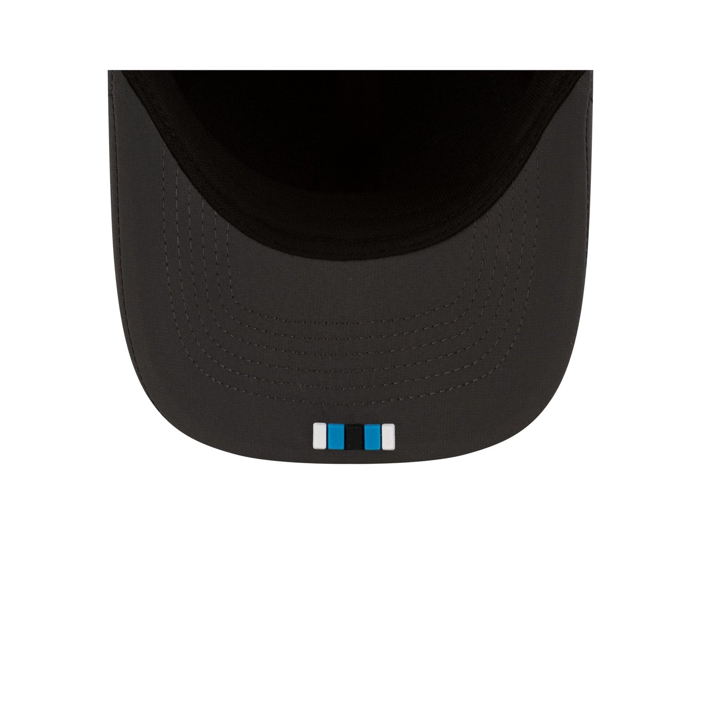 The Carolina Panthers 2025 Sideline Cold Weather Steel Clouds 9FORTY M-Crown Snapback features a sewn-down silicone Panthers logo patch at the front panels with a water-repellent quill tech fabrication throughout and a quick-dry cushioned sweatband to absorb moisture. Additional details include the Official NFL Shield logo to the right of a soft silicone snapback closure at the rear. The crown has bonded seams to trap warmth and the undervisor is accented with a silicone transfer in the team’s colors.