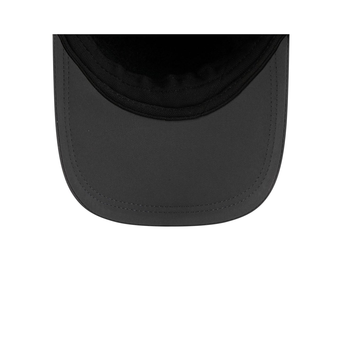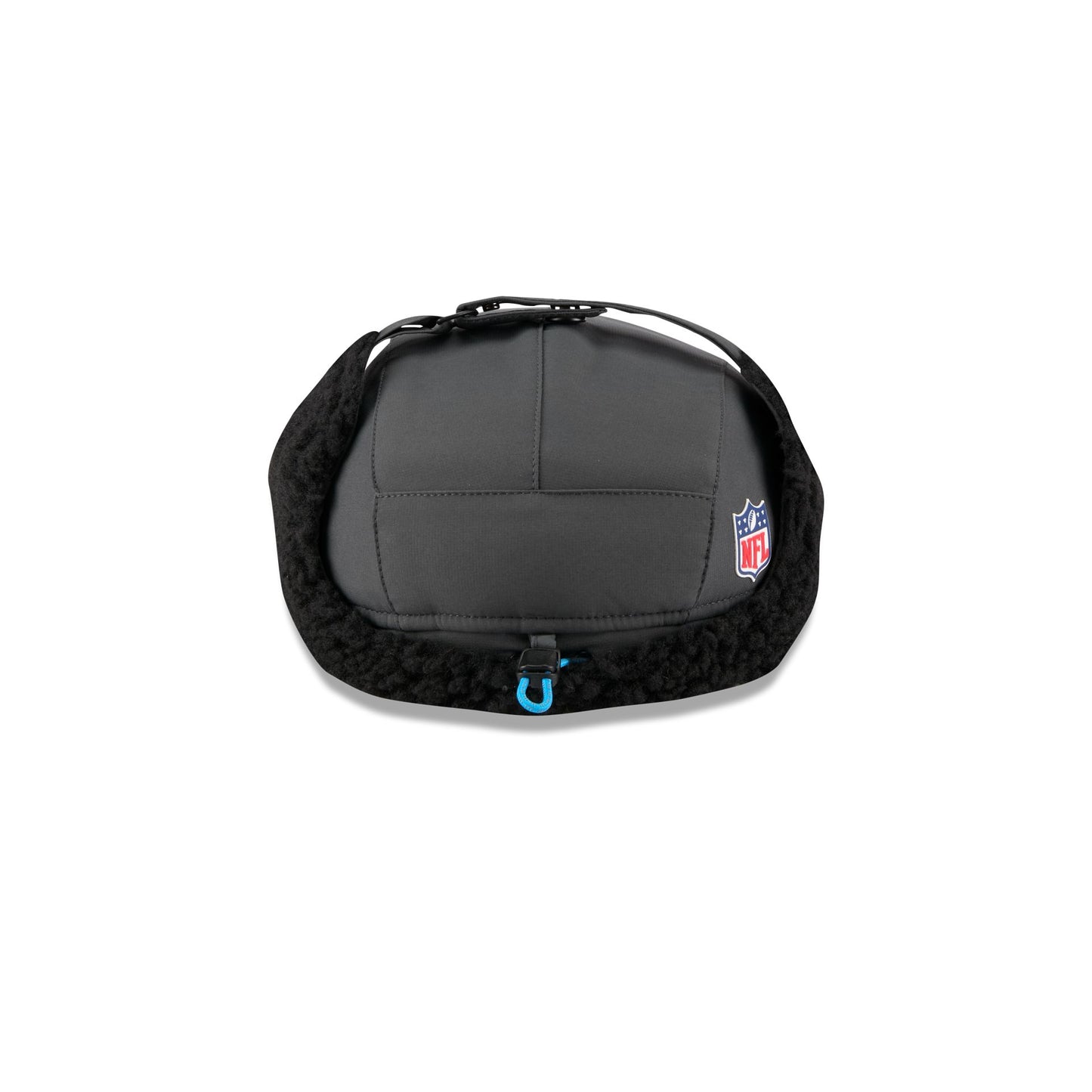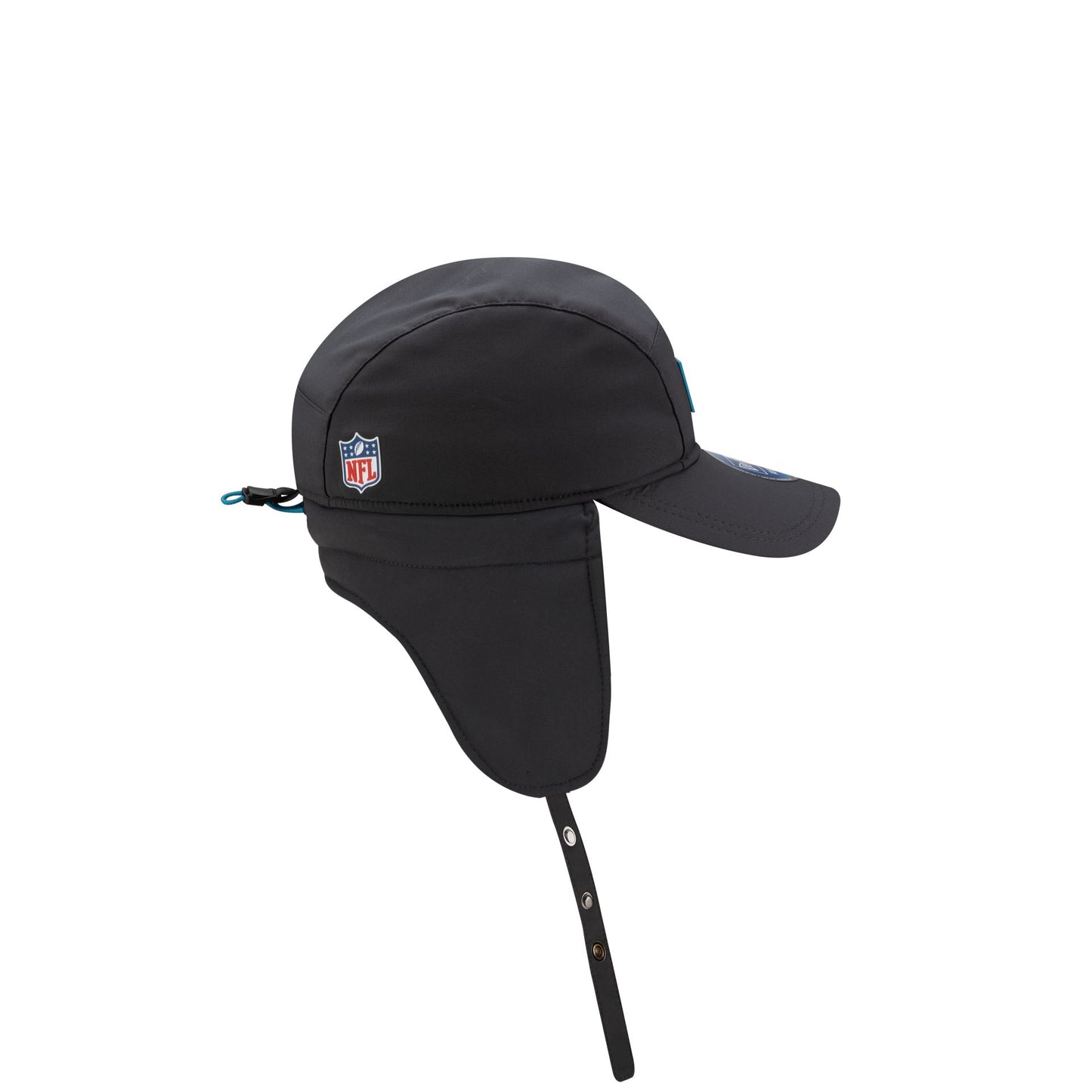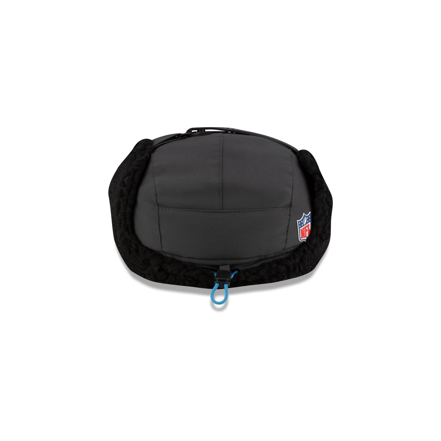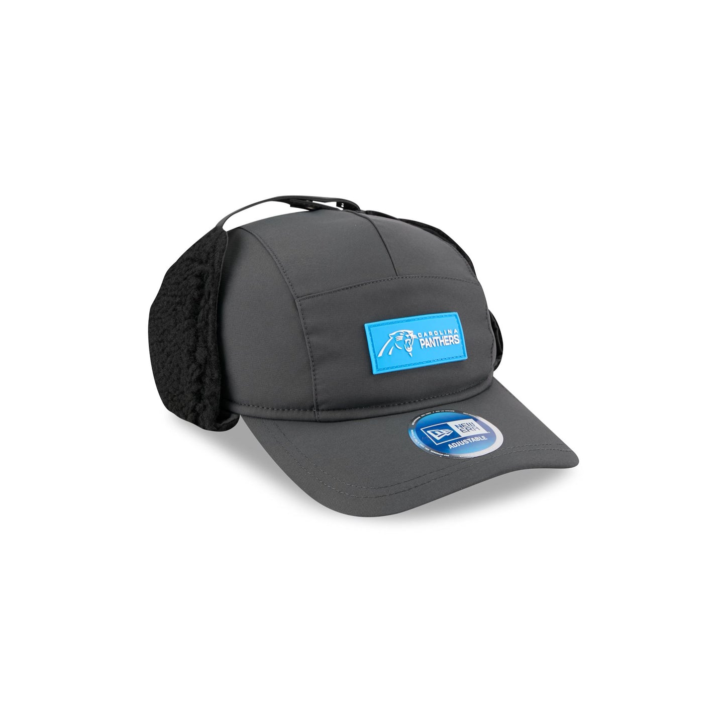 The Carolina Panthers 2025 Sideline Cold Weather Steel Clouds Runner Dogear Adjustable Cap features a sewn-down silicone Panthers logo patch at the front panels with a water-repellent quill tech fabrication throughout with an insulated crown and sherpa lining. Additional details include a buckle strap button secured at the top of the crown that folds down to cover the ears, and an adjustable elastic toggle at the back for a customizable fit.