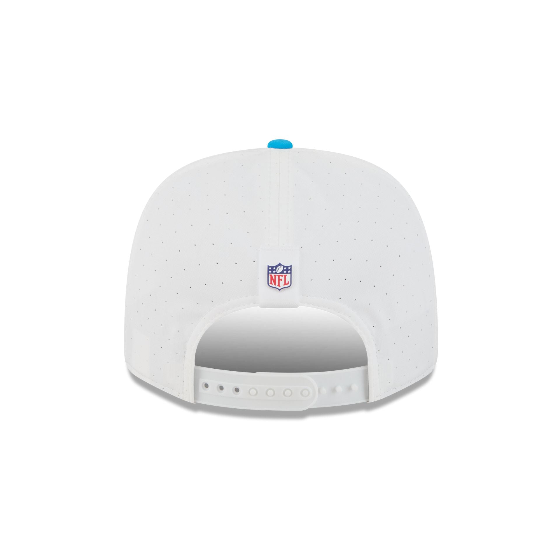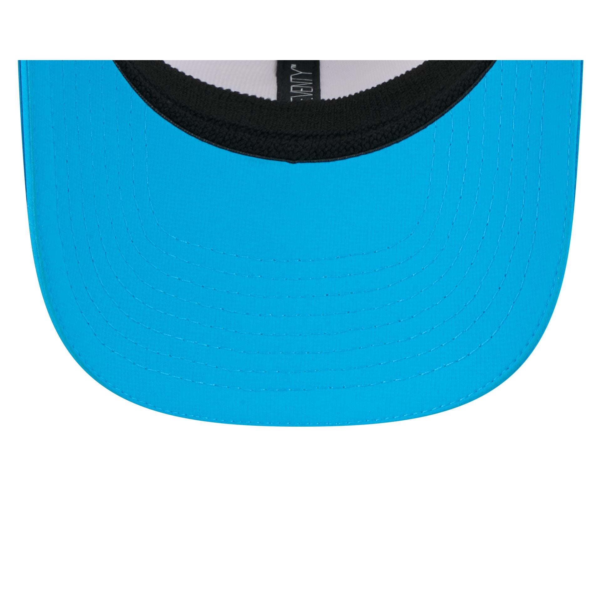 The Carolina Panthers 2025 Training 9SEVENTY Stretch-Snap Cap features a silicone Panthers patch at the front panels with team color stripes at the front of a blue visor. Additional details include a silicone NFL Shield patch on a woven foldover tab above a snapback closure at the rear.