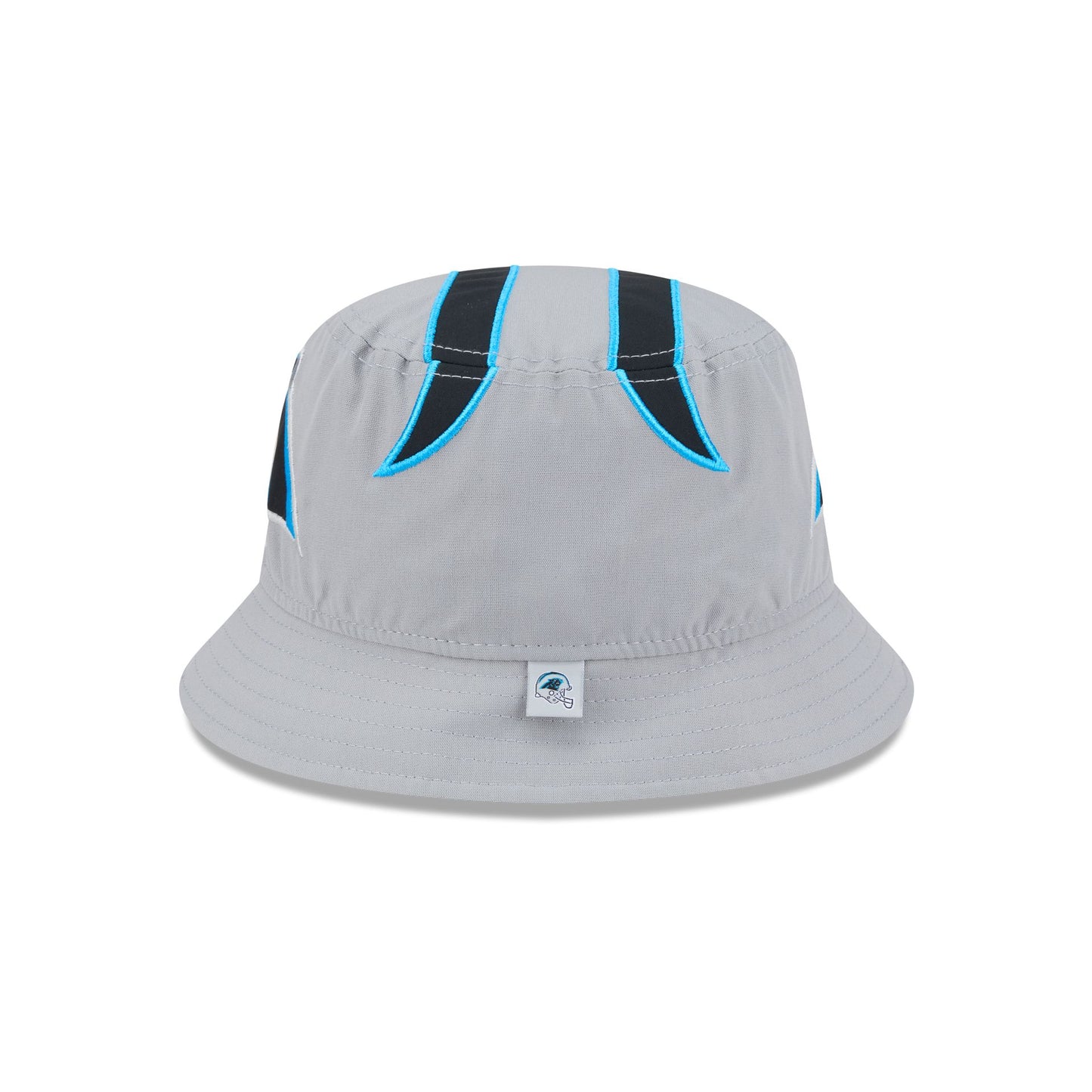 The Carolina Panthers Helmet Bucket Hat features an embroidered Panthers helmet design throughout.