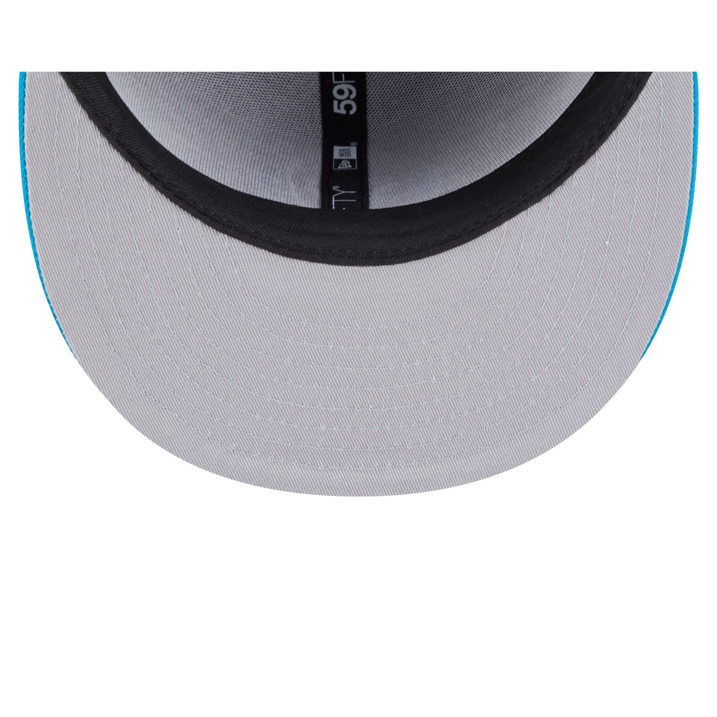 The Charlotte FC 2025 MLS Kickoff 59FIFTY Fitted Cap features an embroidered Charlotte FC logo at the front panels with a matching MLS Shield at the rear and a gray undervisor.