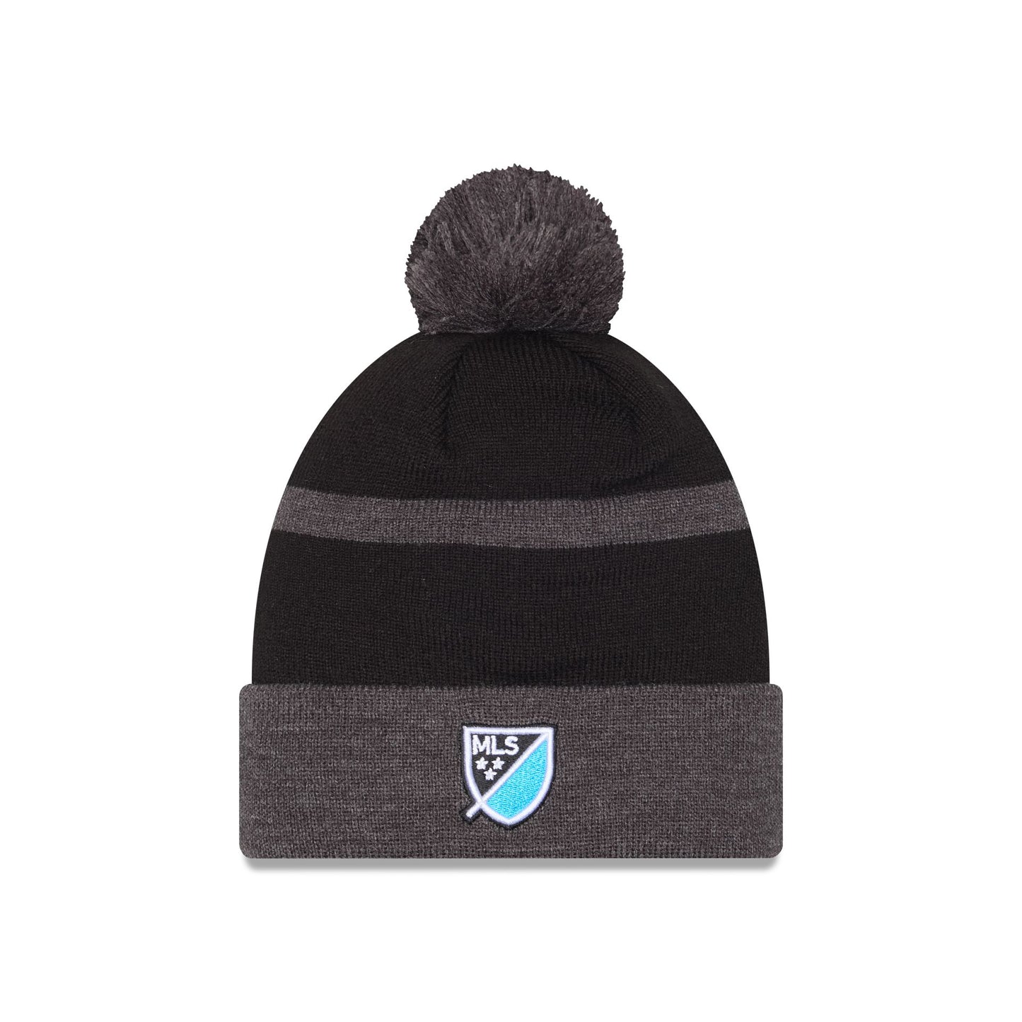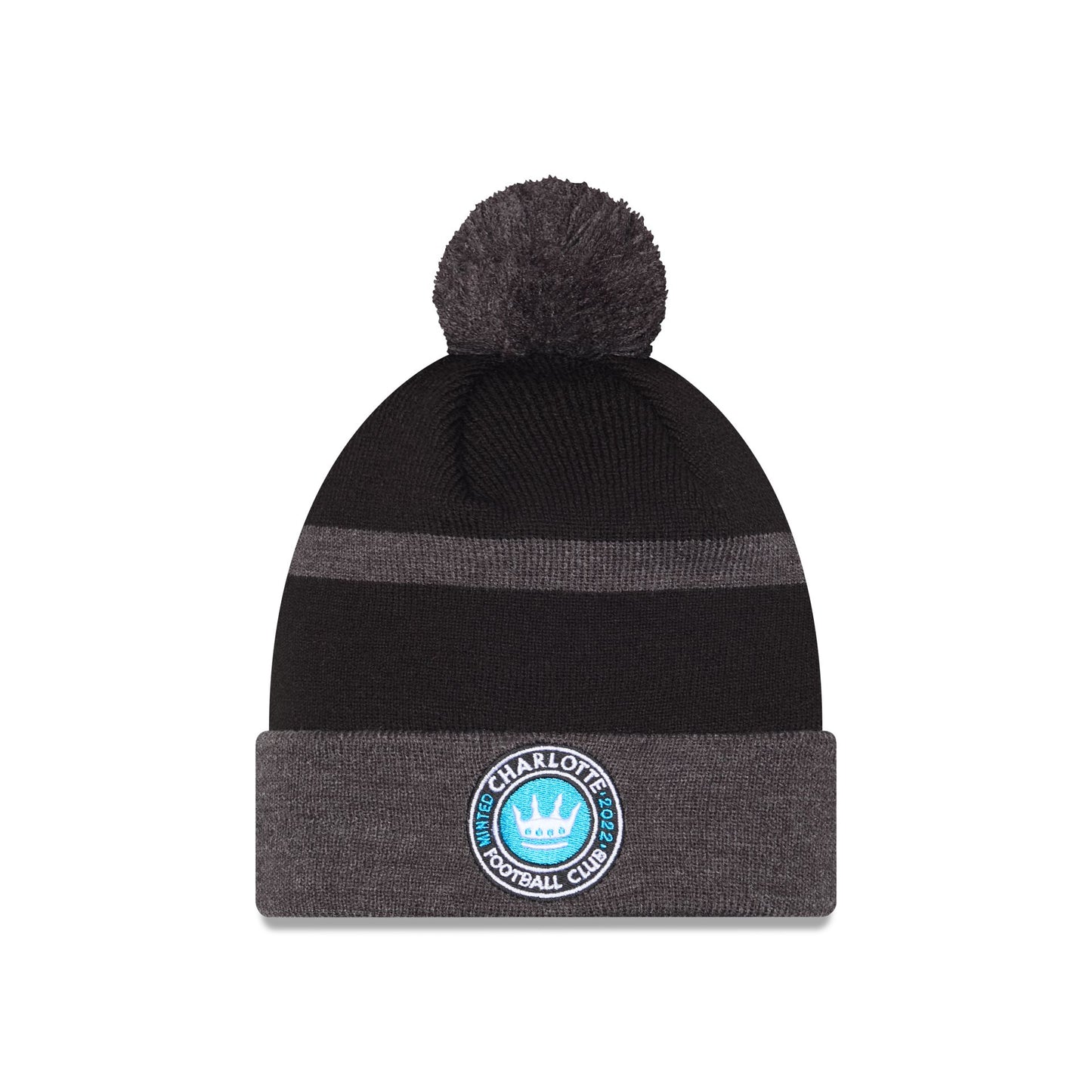 The Charlotte FC 2025 MLS Kickoff Pom Knit features an embroidered Charlotte FC logo at the front cuff with a matching MLS Shield at the rear and a one-time removable pom.