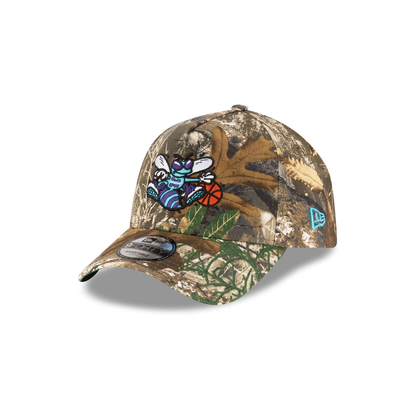 The Charlotte Hornets 1988-2002 Hardwood Classics Realtree 9FORTY A-Frame Snapback Cap features an embroidered Hornets 1988-2002 Hardwood Classics logo at the front panels with a banner patch at the right-wear side. Additional details include a Realtree camo pattern throughout, an adjustable snapback closure at the rear, and a green undervisor.